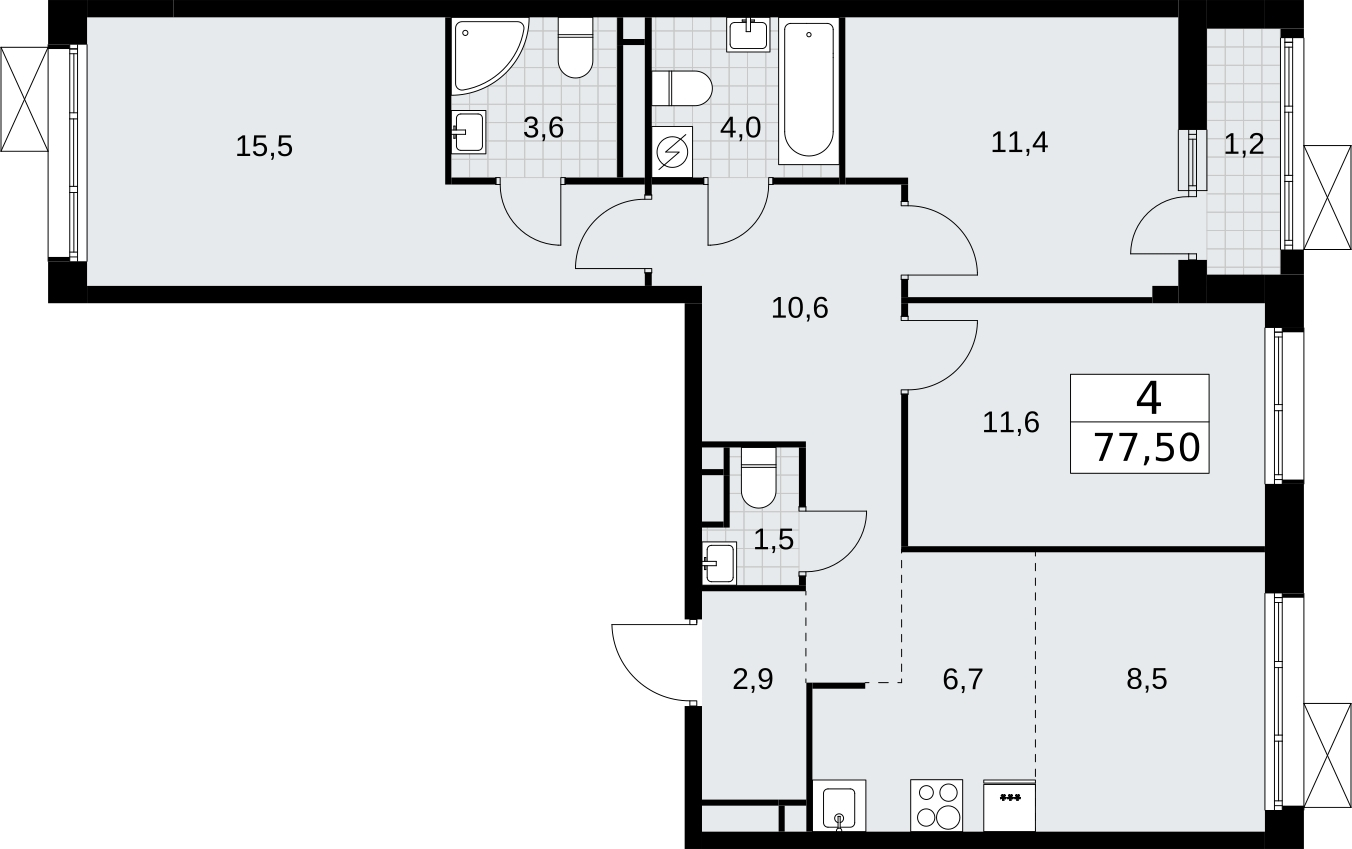 Четырехкомнатная квартира с европланировкой от застройщика в ЖК "Родные кварталы" на 8 этаже. Квартира без отделки, полностью готова к чистовой отделке и дальнейшему ремонту. Общая площадь: 77.5 кв.м., жилая: 47 кв.м., общая площадь гостиной-столовой с кухонной зоной: 15.2 кв.м. Европланировка, зона гостиной комнаты объединена с кухней. Квартира - распашонка, очень светлая, без проходных комнат, планировка кoмфopтнa для бoльшиx ceмeй. В квартире одна лоджия, два совмещенных и один раздельный санузел. Высота потолков 2.9 м. Имеется ниша под гардероб. Дом монолитный, многоподъездный, высотой 9 этажей. Квартира находится во 2-й секции в корпусе 2. На этаже 8 квартир. В подъезде 1 грузовой лифт. Начало строительства - 4 квартал 2023 года. Окончание строительства - 3 квартал 2026 года. Оформление сделки по договору долевого участия. Артикул квартиры по базе застройщика 96К-2-90. ПРЕДЛОЖЕНИЯ ОТ ЗАСТРОЙЩИКА В ОКТЯБРЕ 2025: Ипотека от 13,9 % для всех! На весь срок. "Семейная ипотека" вернулась. Ставка от 3,5 % на весь срок! Без удорожания! Выгодное ипотечное комбо: Ипотека от 2200 р./мес. и от 6 % после рождения ребёнка! Ипотека для всех "Держи пять!" - ставка 5 % на 2 года! *более подробную информацию по скидкам и акциям уточняйте в отделе продаж Новый жилой комплекс "Родные кварталы" строится в уютной, экологически благополучной локации на юго-западе столицы. В ближайшем окружении – ухоженные малоэтажные посёлки и живописный Ульяновский лесопарк. Благодаря этому из окон откроются вдохновляющие виды, которые не исчезнут со временем за фасадами многоэтажек. Через весь район пройдёт главный бульвар, который свяжет набережную, жилые кварталы и площади в единое дружелюбное пространство, органично наполненное узнаваемыми элементами культурных традиций разных народов. В жилом комплексе создаются условия для комфортного отдыха и занятий спортом всех жителей. Здесь можно прогуляться и отдохнуть в лесопарке на берегу ручья, позаниматься на тренажёрах под открытым небом и спортивных площадках. Для малышей построят игровые комплексы, развивающие силу, координацию и ловкость. Всего в жилом комплексе будет оборудовано 6 га территории для спокойного отдыха и около 9 га — для активного. Подъезды в домах освещены в любое время суток, входы и вестибюль хорошо просматриваются с улицы. Витражное остекление обеспечивает приток естественного света днём, а вечером зажигаются светильники. В отделке домов используется сочетание вентилируемого фасада с облицовкой из фибробетонной плитки и штукатуркой. Комфортная высота домов соразмерна человеку и в среднем составляет 10 этажей. Все дома обеспечены собственными подземными паркингами. В них размещаются машино-места и кладовые. В паркинг или кладовую можно спуститься на лифте или по лестнице. В комплексе появятся бытовые сервисы, магазины, аптеки и другие торгово-бытовые объекты. В жилом районе «Родные кварталы» будут построены: - образовательный центр: школа на 1300 учеников и детский сад на 250 малышей, - два детских сада на 200 мест каждый (один из них сдаётся в 1-й очереди). В транспортной доступности уже работают: - школа № 41 и детский сад — по Боровскому шоссе, - школа № 2057 и детский сад — на запад от района, в дер. Марушкино. ЖК «Родные кварталы» строится в Новомосковском округе столицы, в 15 минутах на автомобиле от аэропорта «Внуково». Район обеспечен 