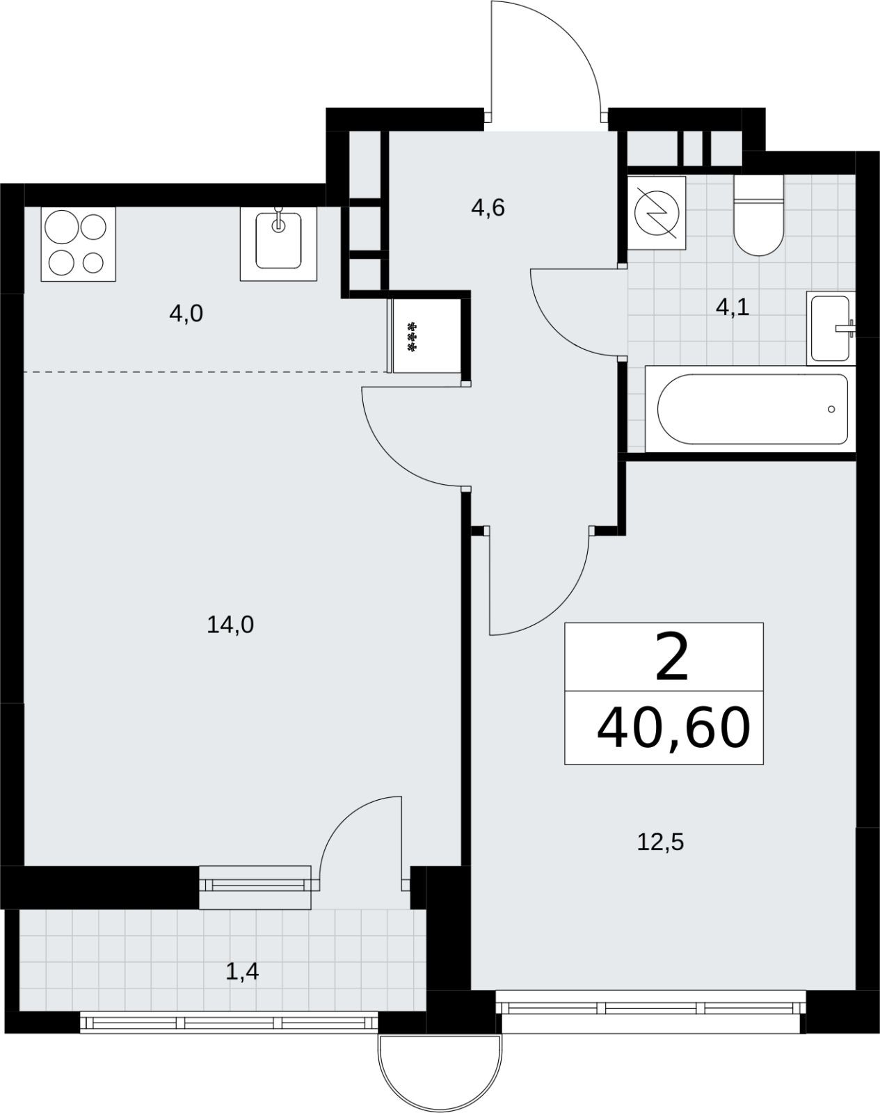 - Общая площадь 40.6 м²