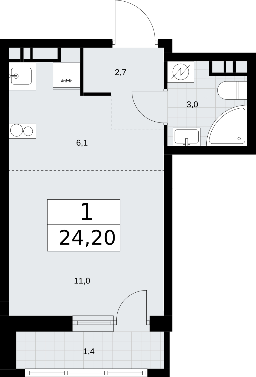 1-комн. квартира-студия от застройщика в ЖК "Родные кварталы" на 7 этаже. Квартира без отделки, новый собственник может сделать ремонт по своему проекту. Общая площадь: 24.2 кв.м., площадь гостиной 17.1 кв.м., из которых 6.1 кв.м. выделено под кухонную зону. Все окна выходят на одну сторону. В квартире один балкон, один совмещенный санузел. Высота потолков 2.95 м. Дом монолитный, черырехподъездный, высотой 10 этажей. Квартира находится во 2-й секции в корпусе 3.1. На этаже 5 квартир. В подъезде 1 грузовой лифт. Начало строительства - 2 квартал 2024 года. Окончание строительства - 3 квартал 2026 года. Оформление сделки по договору долевого участия. Артикул квартиры по базе застройщика 96К-3.1-73. ПРЕДЛОЖЕНИЯ ОТ ЗАСТРОЙЩИКА В ОКТЯБРЕ 2025: Ипотека от 13,9 % для всех! На весь срок. "Семейная ипотека" вернулась. Ставка от 3,5 % на весь срок! Без удорожания! Выгодное ипотечное комбо: Ипотека от 2200 р./мес. и от 6 % после рождения ребёнка! Ипотека для всех "Держи пять!" - ставка 5 % на 2 года! *более подробную информацию по скидкам и акциям уточняйте в отделе продаж Новый жилой комплекс "Родные кварталы" строится в уютной, экологически благополучной локации на юго-западе столицы. В ближайшем окружении – ухоженные малоэтажные посёлки и живописный Ульяновский лесопарк. Благодаря этому из окон откроются вдохновляющие виды, которые не исчезнут со временем за фасадами многоэтажек. Через весь район пройдёт главный бульвар, который свяжет набережную, жилые кварталы и площади в единое дружелюбное пространство, органично наполненное узнаваемыми элементами культурных традиций разных народов. В жилом комплексе создаются условия для комфортного отдыха и занятий спортом всех жителей. Здесь можно прогуляться и отдохнуть в лесопарке на берегу ручья, позаниматься на тренажёрах под открытым небом и спортивных площадках. Для малышей построят игровые комплексы, развивающие силу, координацию и ловкость. Всего в жилом комплексе будет оборудовано 6 га территории для спокойного отдыха и около 9 га — для активного. Подъезды в домах освещены в любое время суток, входы и вестибюль хорошо просматриваются с улицы. Витражное остекление обеспечивает приток естественного света днём, а вечером зажигаются светильники. В отделке домов используется сочетание вентилируемого фасада с облицовкой из фибробетонной плитки и штукатуркой. Комфортная высота домов соразмерна человеку и в среднем составляет 10 этажей. Все дома обеспечены собственными подземными паркингами. В них размещаются машино-места и кладовые. В паркинг или кладовую можно спуститься на лифте или по лестнице. В комплексе появятся бытовые сервисы, магазины, аптеки и другие торгово-бытовые объекты. В жилом районе «Родные кварталы» будут построены: - образовательный центр: школа на 1300 учеников и детский сад на 250 малышей, - два детских сада на 200 мест каждый (один из них сдаётся в 1-й очереди). В транспортной доступности уже работают: - школа № 41 и детский сад — по Боровскому шоссе, - школа № 2057 и детский сад — на запад от района, в дер. Марушкино. ЖК «Родные кварталы» строится в Новомосковском округе столицы, в 15 минутах на автомобиле от аэропорта «Внуково». Район обеспечен удобными выездами на три крупные современные автотрассы. Здесь уже работает и активно развивается система наземного общественного транспорта, включая междугородние рейсы. Интенсив