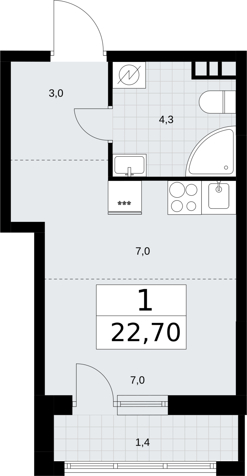 - Общая площадь 22.7 м²