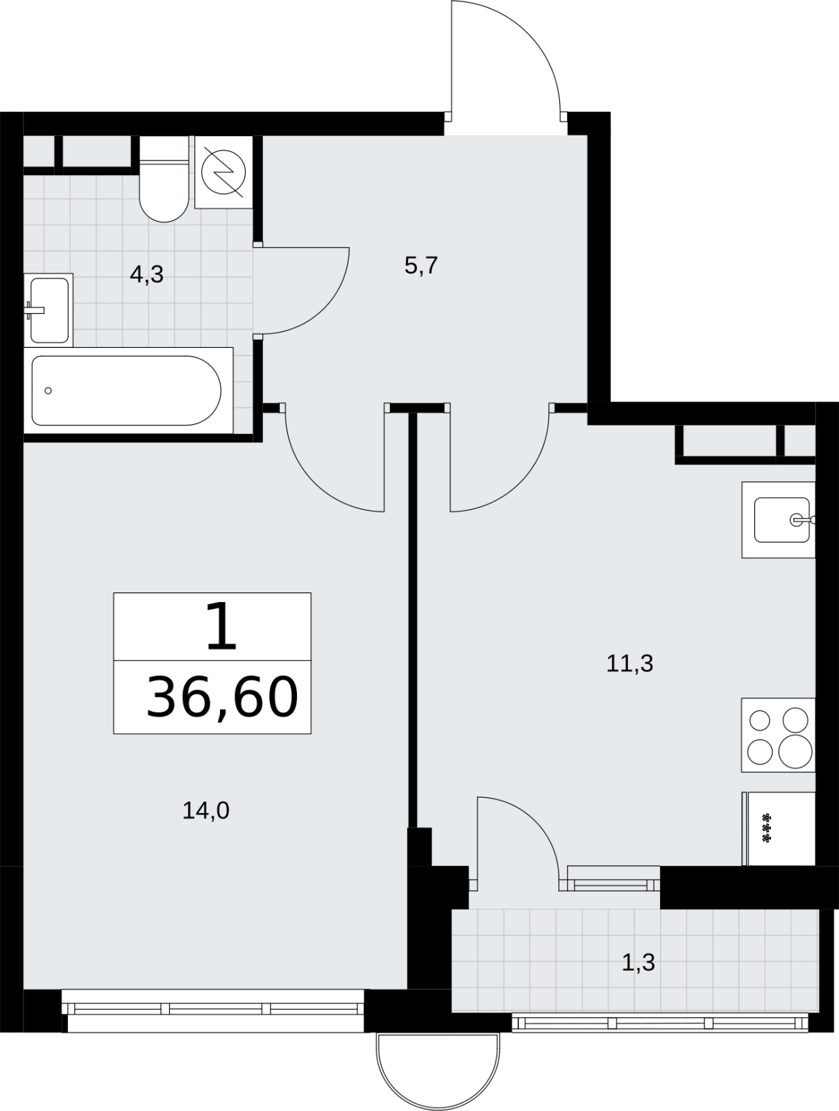 - Общая площадь 36.6 м²
