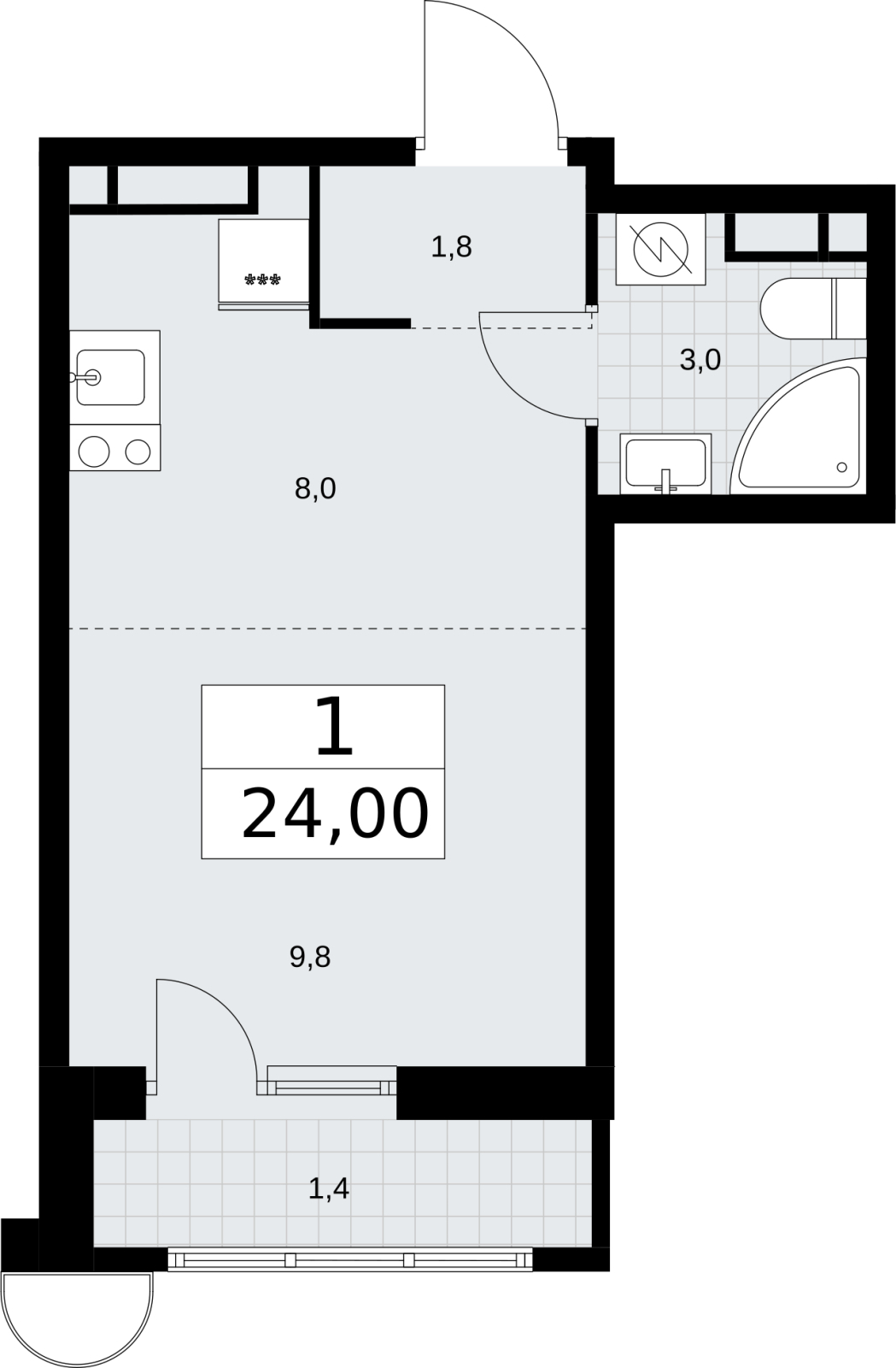 1-комн. квартира-студия от застройщика с отделкой в ЖК "Родные кварталы" на 9 этаже. Общая площадь: 24 кв.м., площадь гостиной 17.8 кв.м., из которых 8 кв.м. выделено под кухонную зону. Все окна выходят на одну сторону. В квартире один балкон, один совмещенный санузел. Высота потолков 2.95 м. Дом монолитный, двухподъездный, высотой 10 этажей. Квартира находится во 2-й секции в корпусе 3.2. На этаже 5 квартир. В подъезде 1 грузовой лифт. Начало строительства - 2 квартал 2024 года. Окончание строительства - 4 квартал 2026 года. Оформление сделки по договору долевого участия. Артикул квартиры по базе застройщика 96К-3.2-272. ПРЕДЛОЖЕНИЯ ОТ ЗАСТРОЙЩИКА В ОКТЯБРЕ 2025: Ипотека от 13,9 % для всех! На весь срок. "Семейная ипотека" вернулась. Ставка от 3,5 % на весь срок! Без удорожания! Выгодное ипотечное комбо: Ипотека от 2200 р./мес. и от 6 % после рождения ребёнка! Ипотека для всех "Держи пять!" - ставка 5 % на 2 года! *более подробную информацию по скидкам и акциям уточняйте в отделе продаж Новый жилой комплекс "Родные кварталы" строится в уютной, экологически благополучной локации на юго-западе столицы. В ближайшем окружении – ухоженные малоэтажные посёлки и живописный Ульяновский лесопарк. Благодаря этому из окон откроются вдохновляющие виды, которые не исчезнут со временем за фасадами многоэтажек. Через весь район пройдёт главный бульвар, который свяжет набережную, жилые кварталы и площади в единое дружелюбное пространство, органично наполненное узнаваемыми элементами культурных традиций разных народов. В жилом комплексе создаются условия для комфортного отдыха и занятий спортом всех жителей. Здесь можно прогуляться и отдохнуть в лесопарке на берегу ручья, позаниматься на тренажёрах под открытым небом и спортивных площадках. Для малышей построят игровые комплексы, развивающие силу, координацию и ловкость. Всего в жилом комплексе будет оборудовано 6 га территории для спокойного отдыха и около 9 га — для активного. Подъезды в домах освещены в любое время суток, входы и вестибюль хорошо просматриваются с улицы. Витражное остекление обеспечивает приток естественного света днём, а вечером зажигаются светильники. В отделке домов используется сочетание вентилируемого фасада с облицовкой из фибробетонной плитки и штукатуркой. Комфортная высота домов соразмерна человеку и в среднем составляет 10 этажей. Все дома обеспечены собственными подземными паркингами. В них размещаются машино-места и кладовые. В паркинг или кладовую можно спуститься на лифте или по лестнице. В комплексе появятся бытовые сервисы, магазины, аптеки и другие торгово-бытовые объекты. В жилом районе «Родные кварталы» будут построены: - образовательный центр: школа на 1300 учеников и детский сад на 250 малышей, - два детских сада на 200 мест каждый (один из них сдаётся в 1-й очереди). В транспортной доступности уже работают: - школа № 41 и детский сад — по Боровскому шоссе, - школа № 2057 и детский сад — на запад от района, в дер. Марушкино. ЖК «Родные кварталы» строится в Новомосковском округе столицы, в 15 минутах на автомобиле от аэропорта «Внуково». Район обеспечен удобными выездами на три крупные современные автотрассы. Здесь уже работает и активно развивается система наземного общественного транспорта, включая междугородние рейсы. Интенсивное развитие локации обеспечивают две действующие станции крупных трансп