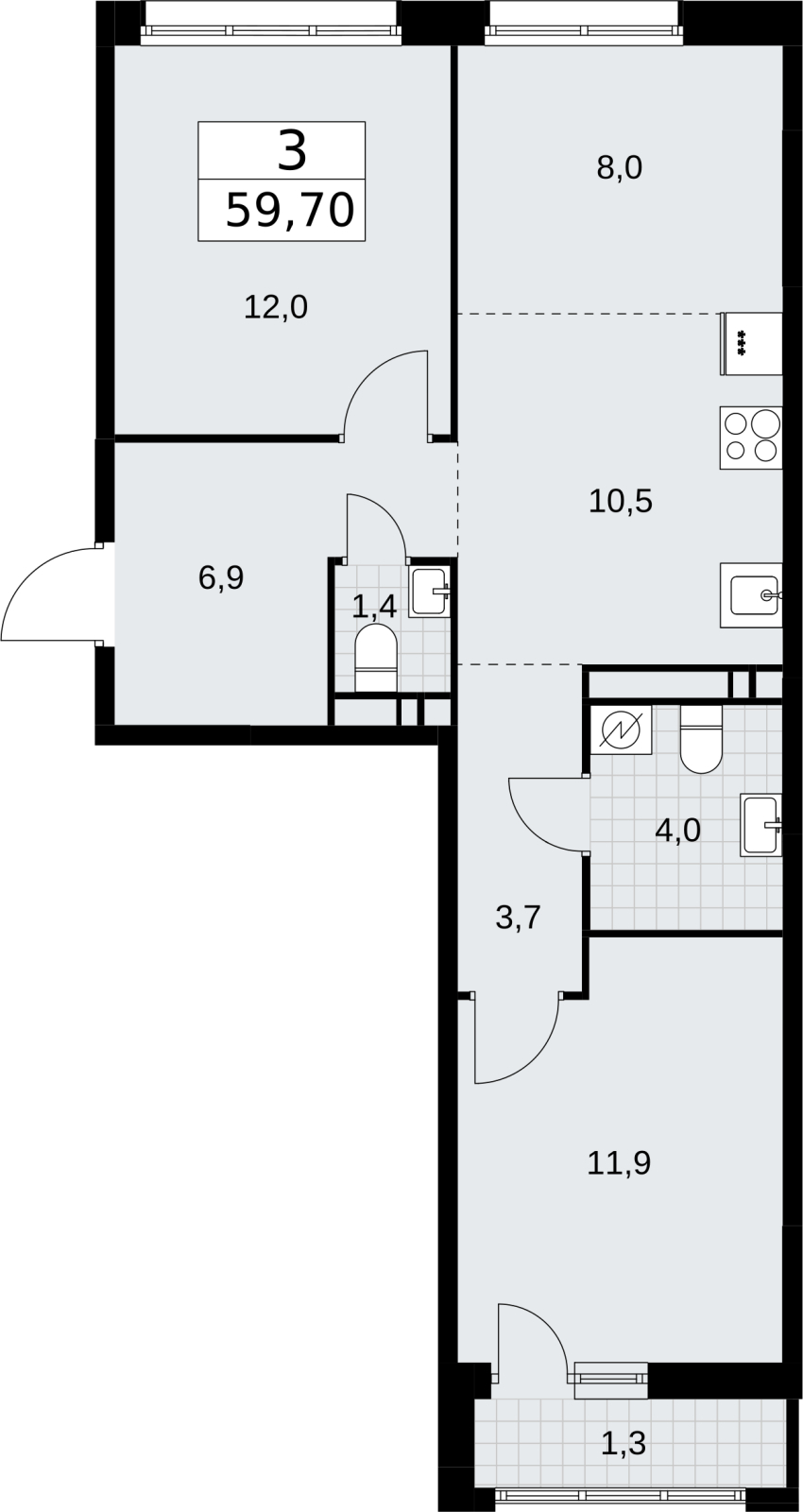 - Общая площадь 59.7 м²