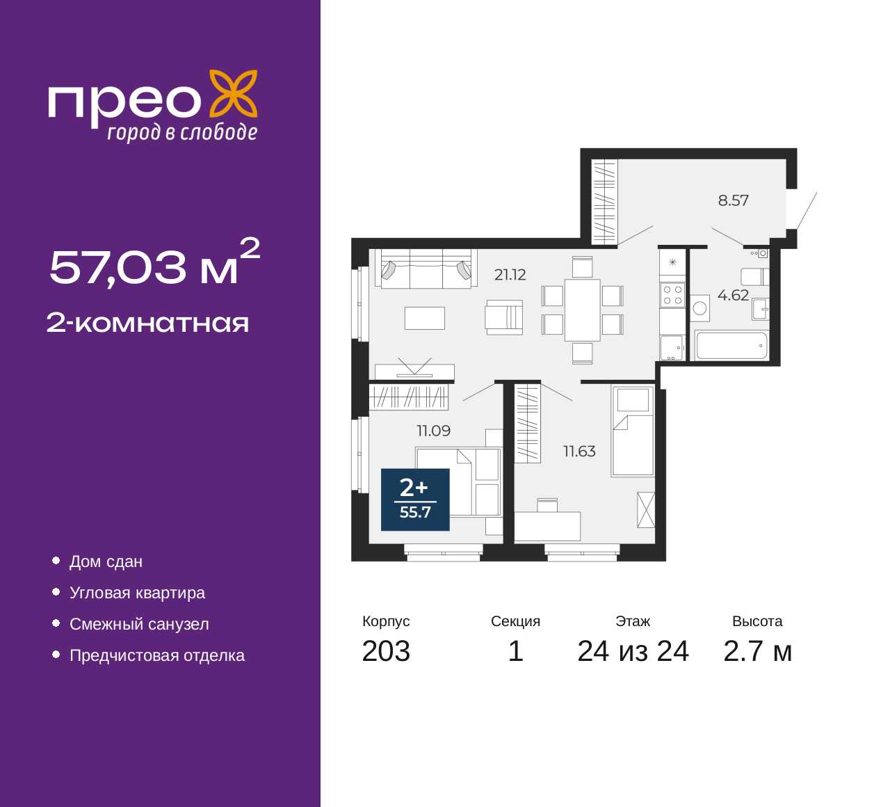 Продается 2-комн. квартира с предчистовой отделкой в ЖК "Прео" на 24 этаже. Общая площадь: 57.03 кв.м., жилая: 22.72 кв.м., площадь просторной кухни-столовой: 21.12 кв.м. Квартира угловая, очень светлая, естественная вентиляция при открытии окон. В квартире один совмещенный санузел. Высота потолков 2.7 м. Квартира находится в корпусе 203. Дом монолитный, одноподъездный, высотой 24 этажа. На этаже 14 квартир. В подъезде 2 грузовых лифта. Строительство окончено, дом сдан в 4 квартале 2024 года. Оформление сделки по договору купли-продажи. Преображенский — один из самых привлекательных районов для жизни! Это полностью самостоятельный жилой район с точки зрения инфраструктуры. Преображенский находится между Московским и Червишевским трактами в квартале улиц Закалужская — Вьюжная — Александра Протозанова. Не нужно ждать, когда появится инфраструктура — переезжайте на всё готовое. Вблизи расположены действующие школа и детский сад. В этом году откроется еще один сад, а в следующем году — школа. По соседству с Преображенским запланировано строительство городского парка «Комарово» площадью 38 гектар. За 10 минут можно доехать на автомобиле до крупных ТРЦ: «Лента», «Кристалл», «Леруа Мерлен», «Метро» и «Ашан». С 2018 года в районе открыт Соседский центр — пространство, созданное для формирования добрососедской среды, совместного досуга, общения и реализации соседских инициатив. Здесь проходят встречи соседей, а также сами жители района организовывают мероприятия. Организатором такого события может стать любой желающий. В квартирах выполнена качественная предчистовая отделка. Гладкие стены с финишным выравниванием по маякам. Ровный потолок для установки натяжного потолка. Установлены пятикамерные окна с двойным стеклопакетом (3 стекла). Дизайнерские холлы с видеонаблюдением, безбарьерным и прозрачным входом – всегда светло и спокойно. На первом этаже есть просторные колясочные, где все жители могут оставлять свои коляски и велосипеды. В Преображенском есть всё, что нужно для активного отдыха и занятий спортом. Мы сделали большое футбольное поле с безопасным покрытием. Также установили хоккейный корт, который оборудован по всем необходимым стандартам. Во дворах можно делать упражнения на специальных площадках с турниками. Весь район мы обустроили велодорожками, которые связаны в единый маршрут. У нас есть сухие фонтаны, бьющие из земли, деревья, веревки, сетки, скалодром, газон, песок и резинка — осталось просто дать своему ребенку право на свободную игру. По-настоящему хорошие дворы — это те, которые дети предпочитают соцсетям и телевизору. Аккредитация в банках: «Сбербанк России», ОАО «Альфа-Банк», ПАО Банк «ВТБ», ПАО «Газпромбанк», ПАО «Банк Уралсиб» и других. (AQID02278568)