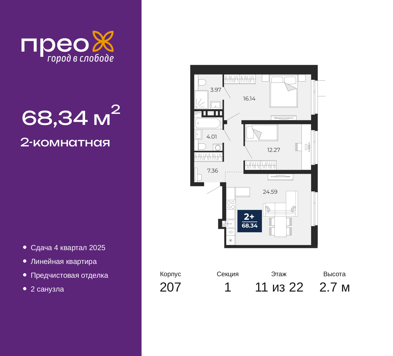Просторная двухкомнатная квартира с предчистовой отделкой в ЖК "Прео" на 11 этаже. Общая площадь: 68.34 кв.м., жилая: 28.41 кв.м., площадь просторной кухни-столовой: 24.59 кв.м. Комнаты изолированные, все окна выходят на одну сторону. В квартире два совмещенных санузла. Высота потолков 2.7 м. Дом монолитный, двухподъездный, высотой 22 этажа. Квартира находится в 1-й секции в корпусе 207. На этаже 8 квартир. В подъезде 1 пассажирский и 1 грузовой лифт. Окончание строительства - 4 квартал 2025 года. Оформление сделки по договору долевого участия. Преображенский — один из самых привлекательных районов для жизни! Это полностью самостоятельный жилой район с точки зрения инфраструктуры. Преображенский находится между Московским и Червишевским трактами в квартале улиц Закалужская — Вьюжная — Александра Протозанова. Не нужно ждать, когда появится инфраструктура — переезжайте на всё готовое. Вблизи расположены действующие школа и детский сад. В этом году откроется еще один сад, а в следующем году — школа. По соседству с Преображенским запланировано строительство городского парка «Комарово» площадью 38 гектар. За 10 минут можно доехать на автомобиле до крупных ТРЦ: «Лента», «Кристалл», «Леруа Мерлен», «Метро» и «Ашан». С 2018 года в районе открыт Соседский центр — пространство, созданное для формирования добрососедской среды, совместного досуга, общения и реализации соседских инициатив. Здесь проходят встречи соседей, а также сами жители района организовывают мероприятия. Организатором такого события может стать любой желающий. В квартирах выполнена качественная предчистовая отделка. Гладкие стены с финишным выравниванием по маякам. Ровный потолок для установки натяжного потолка. Установлены пятикамерные окна с двойным стеклопакетом (3 стекла). Дизайнерские холлы с видеонаблюдением, безбарьерным и прозрачным входом – всегда светло и спокойно. На первом этаже есть просторные колясочные, где все жители могут оставлять свои коляски и велосипеды. В Преображенском есть всё, что нужно для активного отдыха и занятий спортом. Мы сделали большое футбольное поле с безопасным покрытием. Также установили хоккейный корт, который оборудован по всем необходимым стандартам. Во дворах можно делать упражнения на специальных площадках с турниками. Весь район мы обустроили велодорожками, которые связаны в единый маршрут. У нас есть сухие фонтаны, бьющие из земли, деревья, веревки, сетки, скалодром, газон, песок и резинка — осталось просто дать своему ребенку право на свободную игру. По-настоящему хорошие дворы — это те, которые дети предпочитают соцсетям и телевизору. Аккредитация в банках: ПАО Банк «ВТБ», ПАО «Банк Уралсиб», ОАО «Альфа-Банк», «Сбербанк России», ПАО «Газпромбанк» и других. (AQID02356023)