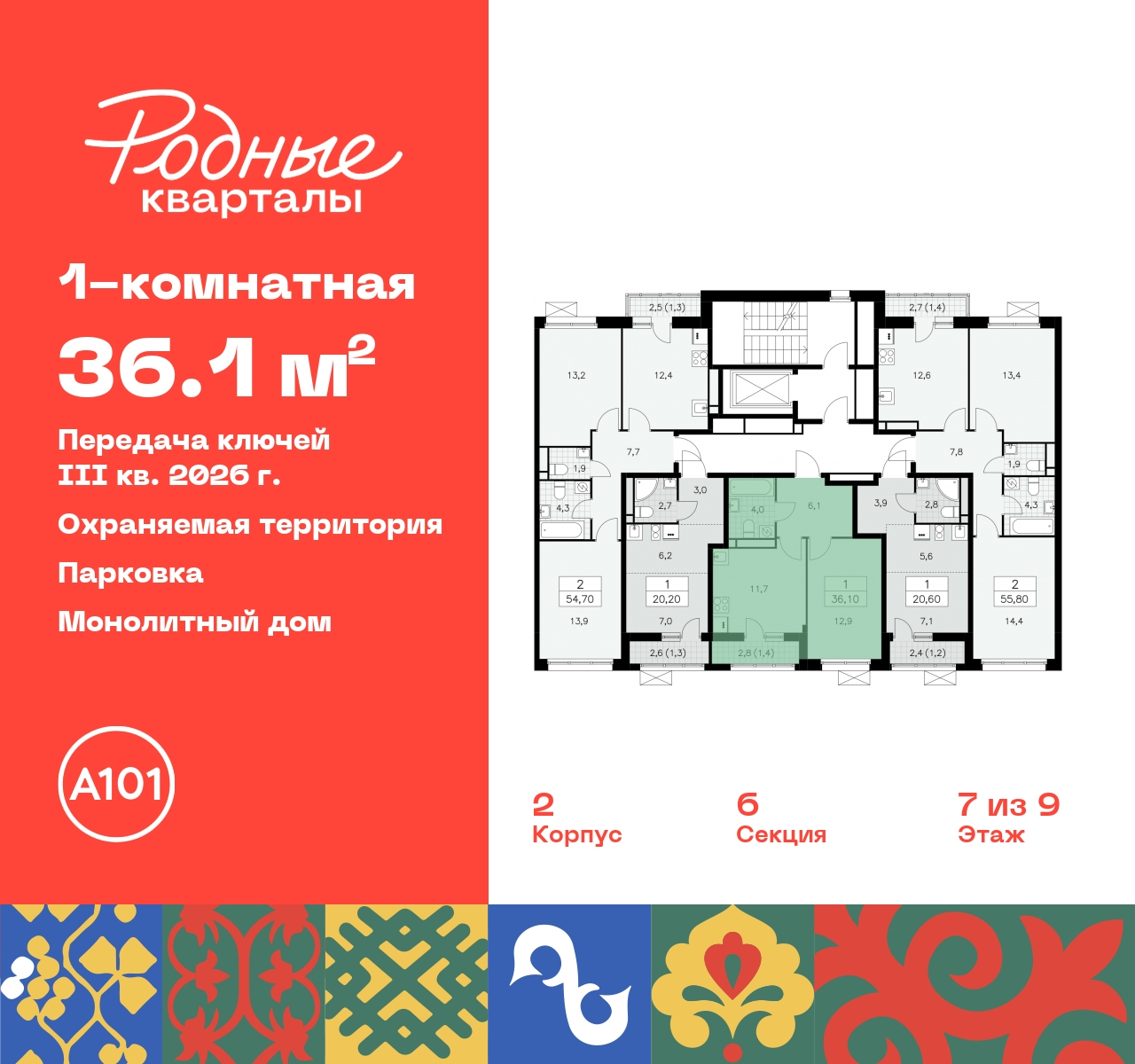 Однокомнатная квартира от застройщика в ЖК "Родные кварталы" на 7 этаже. Квартира без отделки, полностью готова к чистовой отделке и дальнейшему ремонту. Общая площадь: 36.1 кв.м., жилая: 12.9 кв.м., площадь просторной кухни-столовой: 11.7 кв.м. Все окна выходят на одну сторону. В квартире одна лоджия, один совмещенный санузел. Высота потолков 2.9 м. Имеется ниша под гардероб. Дом монолитный, многоподъездный, высотой 9 этажей. Квартира находится в 6-й секции в корпусе 2. На этаже 5 квартир. В подъезде 1 грузовой лифт. Начало строительства - 4 квартал 2023 года. Окончание строительства - 3 квартал 2026 года. Оформление сделки по договору долевого участия. Артикул квартиры по базе застройщика 96К-2-268. ПРЕДЛОЖЕНИЯ ОТ ЗАСТРОЙЩИКА В ОКТЯБРЕ 2025: Ипотека от 13,9 % для всех! На весь срок. "Семейная ипотека" вернулась. Ставка от 3,5 % на весь срок! Без удорожания! Выгодное ипотечное комбо: Ипотека от 2200 р./мес. и от 6 % после рождения ребёнка! Ипотека для всех "Держи пять!" - ставка 5 % на 2 года! *более подробную информацию по скидкам и акциям уточняйте в отделе продаж Новый жилой комплекс "Родные кварталы" строится в уютной, экологически благополучной локации на юго-западе столицы. В ближайшем окружении – ухоженные малоэтажные посёлки и живописный Ульяновский лесопарк. Благодаря этому из окон откроются вдохновляющие виды, которые не исчезнут со временем за фасадами многоэтажек. Через весь район пройдёт главный бульвар, который свяжет набережную, жилые кварталы и площади в единое дружелюбное пространство, органично наполненное узнаваемыми элементами культурных традиций разных народов. В жилом комплексе создаются условия для комфортного отдыха и занятий спортом всех жителей. Здесь можно прогуляться и отдохнуть в лесопарке на берегу ручья, позаниматься на тренажёрах под открытым небом и спортивных площадках. Для малышей построят игровые комплексы, развивающие силу, координацию и ловкость. Всего в жилом комплексе будет оборудовано 6 га территории для спокойного отдыха и около 9 га — для активного. Подъезды в домах освещены в любое время суток, входы и вестибюль хорошо просматриваются с улицы. Витражное остекление обеспечивает приток естественного света днём, а вечером зажигаются светильники. В отделке домов используется сочетание вентилируемого фасада с облицовкой из фибробетонной плитки и штукатуркой. Комфортная высота домов соразмерна человеку и в среднем составляет 10 этажей. Все дома обеспечены собственными подземными паркингами. В них размещаются машино-места и кладовые. В паркинг или кладовую можно спуститься на лифте или по лестнице. В комплексе появятся бытовые сервисы, магазины, аптеки и другие торгово-бытовые объекты. В жилом районе «Родные кварталы» будут построены: - образовательный центр: школа на 1300 учеников и детский сад на 250 малышей, - два детских сада на 200 мест каждый (один из них сдаётся в 1-й очереди). В транспортной доступности уже работают: - школа № 41 и детский сад — по Боровскому шоссе, - школа № 2057 и детский сад — на запад от района, в дер. Марушкино. ЖК «Родные кварталы» строится в Новомосковском округе столицы, в 15 минутах на автомобиле от аэропорта «Внуково». Район обеспечен удобными выездами на три крупные современные автотрассы. Здесь уже работает и активно развивается система наземного общественного транспорта, включая междугородние рейсы.