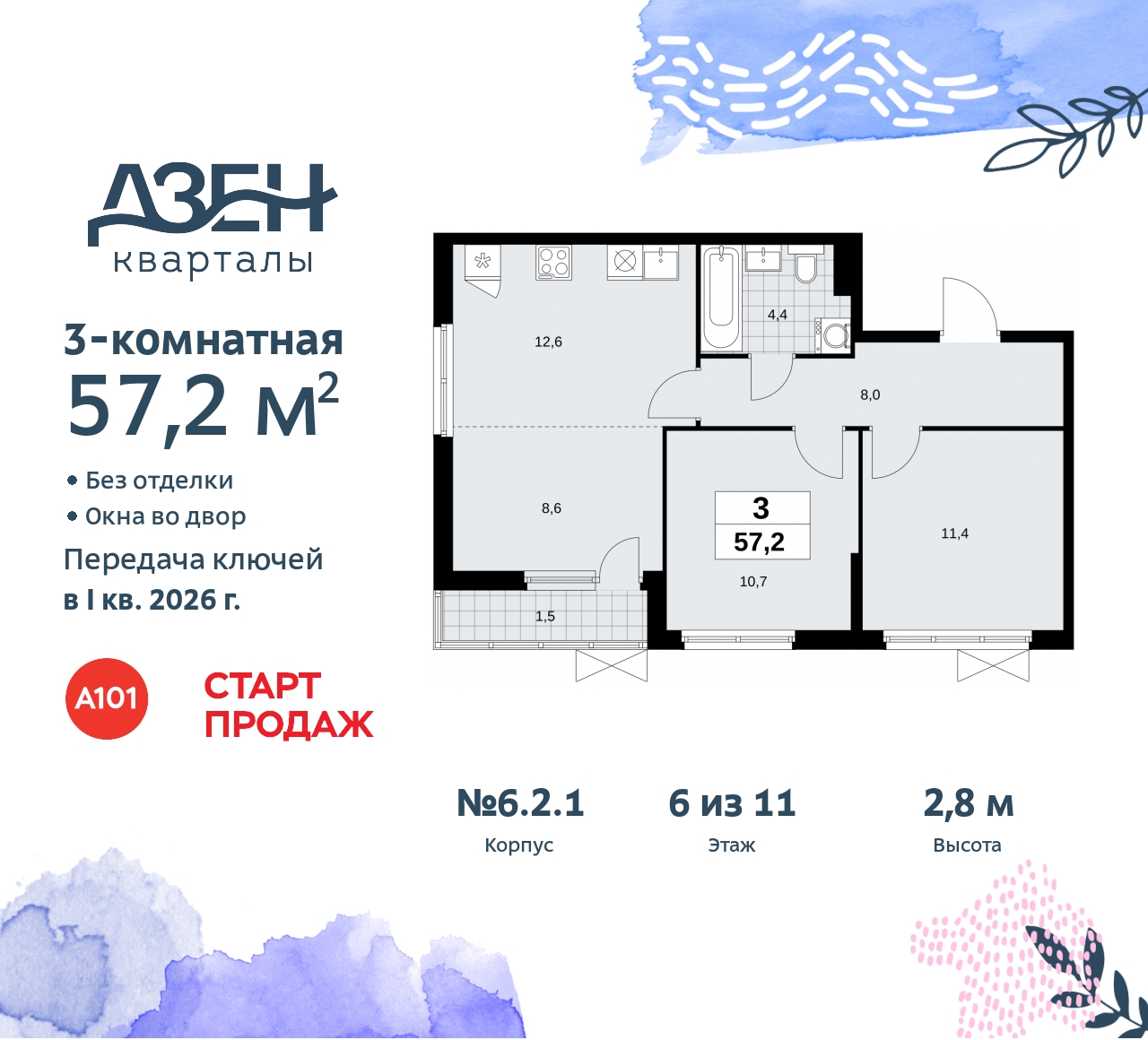 Продается трехкомнатная квартира с европланировкой в ЖК "Дзен-кварталы" на 6 этаже. Квартира без отделки, после оформления собственности можно делать ремонт. Общая площадь: 57.2 кв.м., жилая: 30.7 кв.м., суммарная площадь гостиной-столовой с кухонной зоной: 21.2 кв.м. Европейская планировка, кухня и гостиная объединены в одно просторное помещение. Угловая квартира, окна oбecпeчивaют paвнoмepнoe ocвeщeниe в тeчeниe дня. В квартире одна лоджия, один совмещенный санузел. Высота потолков 2.8 м. Эта квартира предлагается без отделки. Будут установлены стеклопакеты с повышенной тепло- и шумоизоляцией, в квартиру заведены все коммуникации. Вы сможете в полном объеме реализовать ваши идеи обустройства вашего комфортного дома. Дом монолитный, многоподъездный, переменной этажности, от 8 до 11 этажей. Квартира находится в 1-й секции высотой 8 этажей в корпусе 6.2.1. На этаже 5 квартир. В подъезде 1 грузовой лифт. Начало строительства - 4 квартал 2023 года. Окончание строительства - 1 квартал 2026 года. Оформление сделки по договору долевого участия. Артикул квартиры по базе застройщика 41К-6.2.1-21. В шаговой доступности от жилого комплекса имеются станции метро (расстояние по прямой): «Новомосковская (Коммунарка)» (800 м), «Новомосковская» (800 м), «Потапово» (900 м), также недалеко от этого корпуса находятся станции метро: «Коммунарка», «Улица Горчакова», «Бульвар адмирала Ушакова», «Ольховая», «Бунинская аллея». ПРЕДЛОЖЕНИЯ ОТ ЗАСТРОЙЩИКА В ОКТЯБРЕ 2025: Ипотека от 13,9 % для всех! На весь срок. "Семейная ипотека" вернулась. Ставка от 3,5 % на весь срок! Без удорожания! Выгодное ипотечное комбо: Ипотека от 2200 р./мес. и от 6 % после рождения ребёнка! Ипотека для всех "Держи пять!" - ставка 5 % на 2 года! *более подробную информацию по скидкам и акциям уточняйте в отделе продаж Новый район «Дзен-кварталы» возводится на юго-западе столицы – вдоль береговой линии живописного Ивановского пруда и реки Варварки. В основе проекта – «сочетание несочетаемого», гармония простого и утончённого, природного и урбанистического – стиль Japandi, объединяющий скандинавскую функциональность и восточную созерцательность. В приятном соседстве с домами нового района живописный Ивановский пруд — его береговая линия проходит по территории «Дзен-кварталов». Здесь будет благоустроена набережная для отдыха жителей нового района — по авторскому проекту Группы компаний «А101». На территории района появятся два детских сада и крупный образовательный комплекс, в состав которого войдут детский сад и школа. Все они будут спроектированы на основе собственной концепции образовательной среды ГК «А101», разработанной экспертами в области педагогики, детский психологии и эргономики учебных пространств. Фасадные решения выполнены в современном архитектурном стиле, основанном на сочетании японского минимализма и скандинавской функциональности. Использованы природные оттенки спокойного японского пейзажа, материалы, имитирующие натуральные поверхности – штукатурка, облицовочная плитка разных размеров и текстур. Подобный стилистический подход делает пространство созерцательными и гармоничным. Для комфортного хранения габаритных и сезонных вещей на уровне подземного этажа спланированы удобные кладовые помещения. Доступ в них осуществляется на лифте. Отличная транспортная доступность. 2 станции метро, "Коммунарка" и "П