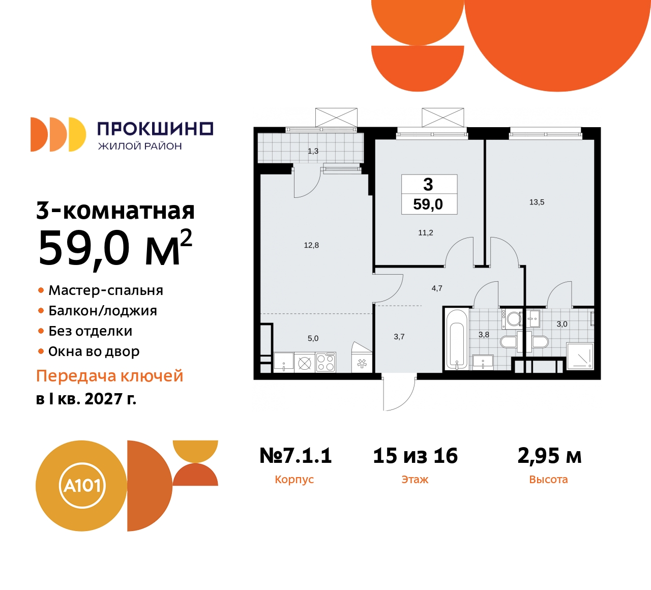 Просторная трехкомнатная квартира с европланировкой в ЖК "Прокшино" на 15 этаже. Квартира без отделки, полностью готова к ремонту. Общая площадь: 59 кв.м., жилая: 37.5 кв.м., общая площадь гостиной-столовой с кухонной зоной: 17.8 кв.м. Европланировка, за счет большой площади кухни-гостиной квартира выглядит просторной и очень удобна для жизни. Комнаты изолированные, все окна выходят на одну сторону. В квартире одна лоджия, два совмещенных санузла. Высота потолков 2.95 м. Эта квартира предлагается без отделки. Будут установлены стеклопакеты с повышенной тепло- и шумоизоляцией, в квартиру заведены все коммуникации. Вы сможете в полном объеме реализовать ваши идеи обустройства вашего комфортного дома. Дом монолитный, трехподъездный, переменной этажности, от 12 до 16 этажей. Квартира находится во 2-й секции высотой 15 этажей в корпусе 7.1.1. На этаже 5 квартир. В подъезде 1 пассажирский и 1 грузовой лифт. Начало строительства - 4 квартал 2024 года. Окончание строительства - 1 квартал 2027 года. Оформление сделки по договору долевого участия. Артикул квартиры по базе застройщика 58К-7.1.1-122. В шаговой доступности от жилого комплекса имеются станции метро (расстояние по прямой): «Филатов луг» (1.4 км), «Прокшино» (1.7 км), также недалеко от этого корпуса расположены станции метро: «Саларьево», «Румянцево», «Теплый стан». ПРЕДЛОЖЕНИЯ ОТ ЗАСТРОЙЩИКА В ОКТЯБРЕ 2025: Ипотека от 13,9 % для всех! На весь срок. "Семейная ипотека" вернулась. Ставка от 3,5 % на весь срок! Без удорожания! Выгодное ипотечное комбо: Ипотека от 2200 р./мес. и от 6 % после рождения ребёнка! Ипотека для всех "Держи пять!" - ставка 5 % на 2 года! *более подробную информацию по скидкам и акциям уточняйте в отделе продаж ЖК «Прокшино» расположен в 7,6 км от МКАД в Новой Москве. В 8 минутах пешком находится станция метро "Прокшино" быстрой и комфортной красной линии метро. Высокую транспортную доступность обеспечивают и два крупных шоссе, до которых легко доехать за 5 минут по новой скоростной автотрассе Солнцево – Бутово – Варшавское шоссе. Жилой комплекс "Прокшино" входит в кластер Прокшино. В районе появятся дома комфорт и бизнес-класса с подземным паркингом, закрытыми благоустроенными дворами без машин, местами для активного и созерцательного отдыха, магазинами, бытовыми сервисами и другими коммерческими объектами. Рядом пруд с собственной набережной и городской парк «Хованская дубрава». Для маленьких жителей построят детские сады, образовательный комплекс. (AQID02421810)