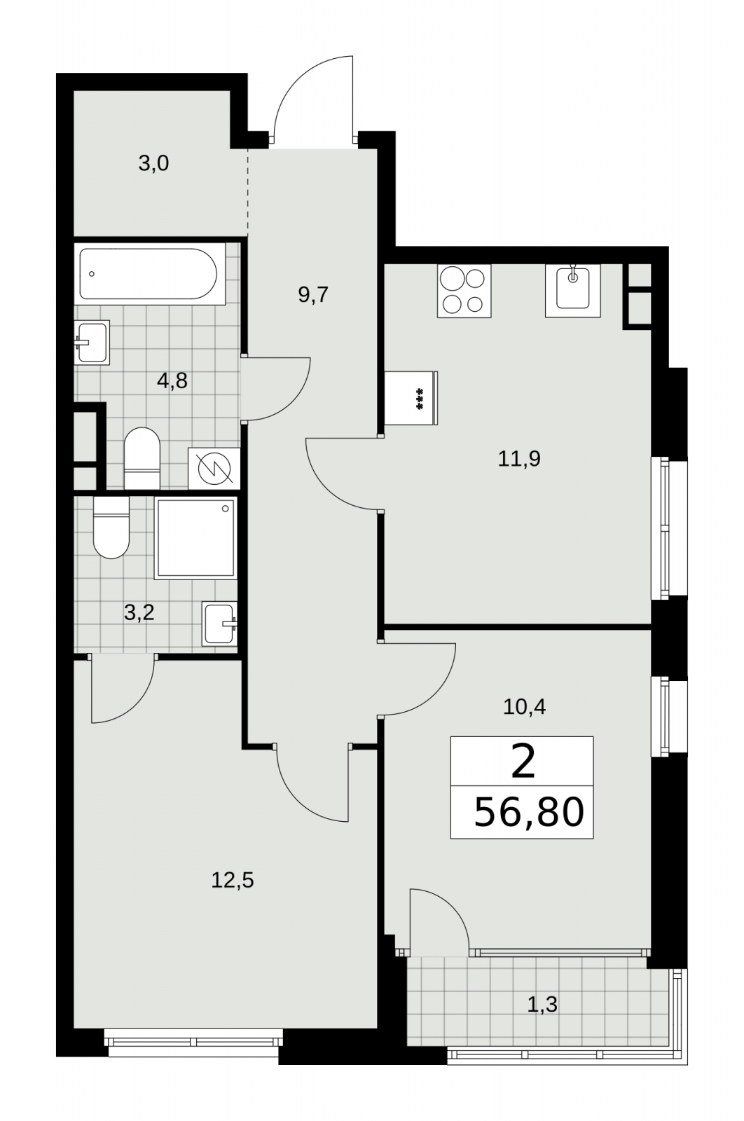 - Общая площадь 56.8 м²