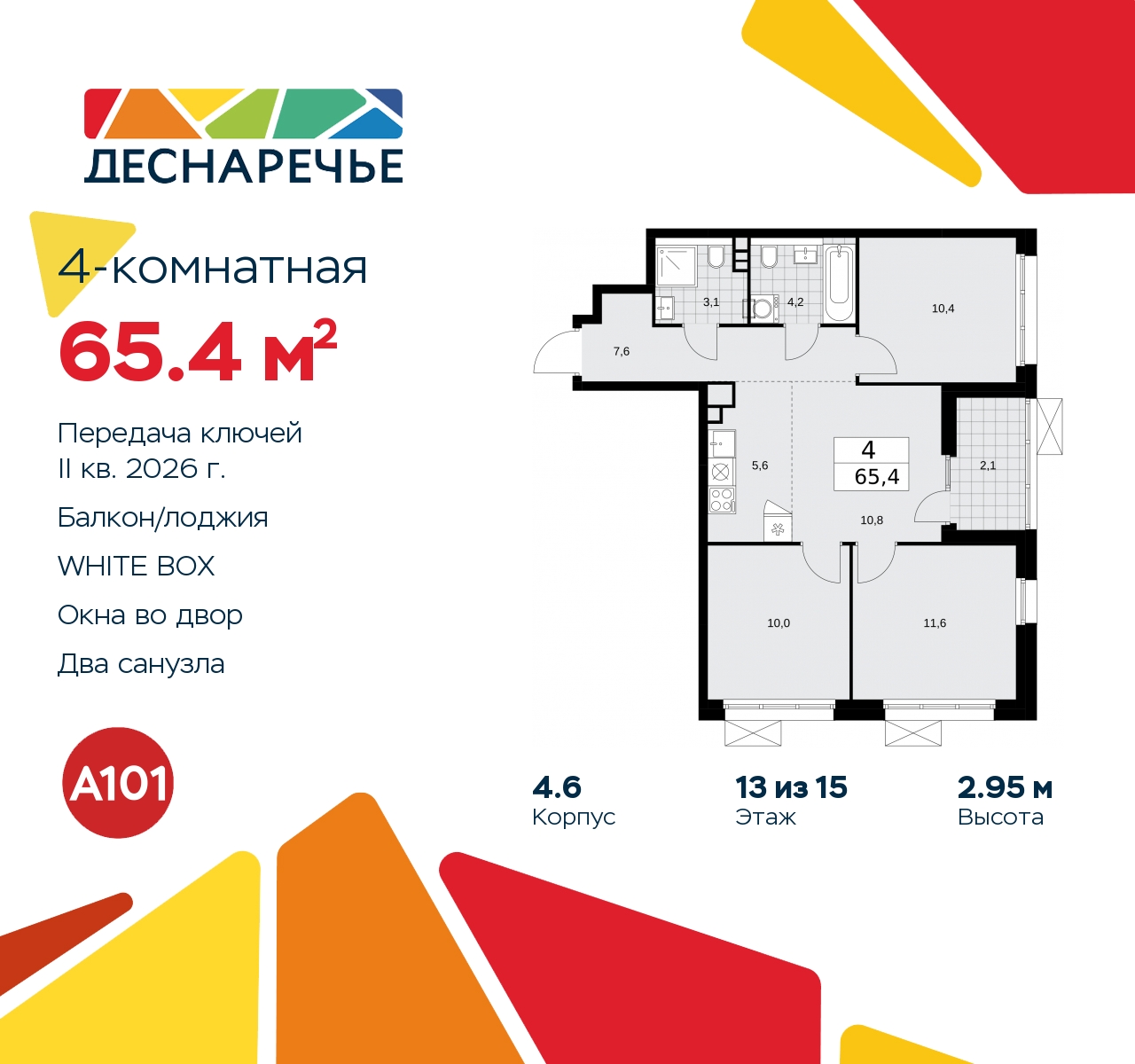 4-комн. квартира с европланировкой и предчистовой отделкой в ЖК "Деснаречье" на 13 этаже. Общая площадь: 65.4 кв.м., жилая: 42.8 кв.м., суммарная площадь гостиной-столовой с кухонной зоной: 16.4 кв.м. Европланировка, за счет большой площади кухни-гостиной квартира выглядит просторной и очень удобна для жизни. Квартира угловая, идеально подойдет любителям тишины и панорамных видов. В квартире одна лоджия, два совмещенных санузла. Высота потолков 2.95 м. Эта квартира будет сдана с предчистовой отделкой white box – это квартира с ровными белыми стенами. Такая отделка позволяет сразу приступить к чистовой отделке: выбрать цвета и материалы для стен и полов, купить и расставить мебель и оборудование, развесить светильники и подобрать декор. При желании вы можете дозаказать дизайнерскую отделку от застройщика, на ваш выбор представлено несколько вариантов стилистических решений. Квартира находится в корпусе 4.6. Дом монолитный, одноподъездный, высотой 15 этажей. На этаже 10 квартир. В подъезде 1 пассажирский и 1 грузовой лифт. Начало строительства - 3 квартал 2023 года. Окончание строительства - 2 квартал 2026 года. Оформление сделки по договору долевого участия. Артикул квартиры по базе застройщика 88К-4.6-1416. ПРЕДЛОЖЕНИЯ ОТ ЗАСТРОЙЩИКА В ОКТЯБРЕ 2025: Ипотека от 13,9 % для всех! На весь срок. "Семейная ипотека" вернулась. Ставка от 3,5 % на весь срок! Без удорожания! Выгодное ипотечное комбо: Ипотека от 2200 р./мес. и от 6 % после рождения ребёнка! Ипотека для всех "Держи пять!" - ставка 5 % на 2 года! *более подробную информацию по скидкам и акциям уточняйте в отделе продаж Масштабный проект "Деснаречье" на юго-западе Москвы, который включает три новых района («квартала»), объединённые общей идеей – воплотить в реальность мечты современных жителей столицы об интересном, комфортном и разноплановом городском пространстве в окружении рек и лесов, словно сошедших с полотен русских живописцев: - «Берег» оценят все, кому близка водная стихия: плеск волн, солнечные блики и прогулки вдоль тихого течения речи. - «Лес» утопает в зелени парков и лесов. Здесь соблюдён идеальный баланс загородного спокойствия и столичного комфорта. - «Парк», самый энергичный и яркий, отличается высокой концентрацией пространств для спорта и творчества. Жилой комплекс "Деснаречье" расположится в 12 км от МКАД по современному Калужскому шоссе. Внешний облик зданий соответствует современному стилю и стандартам, характерным и для других популярных проектов ГК «А101»: сочетание контрастных тонов, большое количество остекления, в котором отражается небо, гармония с природным окружением. Весь город - в вашем районе. Находиться на территории «15-минутного города» значит иметь всё необходимое для полноценной жизни в шаговой доступности. Маршруты в районе «Деснаречье» выстроены так, чтобы добраться до магазинов, парков, школ, салонов услуг и других объектов можно было всего за несколько минут пешком или на велосипеде. Двор закрытый от машин – это тишина, комфорт и безопасность, поэтому все машино-места (включая «семейные» и увеличенные, с возможностью установки роллетных шкафов) находятся в подземном паркинге. В паркинги можно спуститься на лифте из любого подъезда или по лестнице. Рядом с «Деснаречьем» в 2027 году планируется открытие станции метро «Десна», до которой будет удобно добраться пешком или на велосипеде