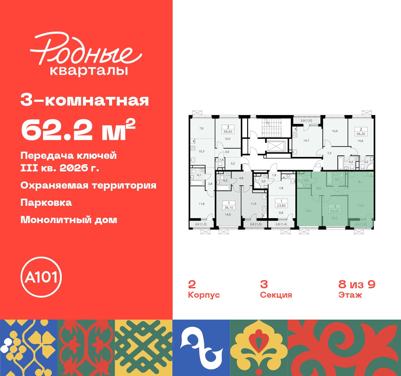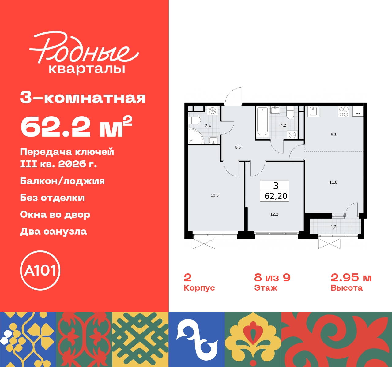 Просторная трехкомнатная квартира с европланировкой в ЖК "Родные кварталы" на 8 этаже. Квартира без отделки, после выдачи ключей можно делать ремонт. Общая площадь: 62.2 кв.м., жилая: 36.7 кв.м., суммарная площадь гостиной-столовой с кухонной зоной: 19.1 кв.м. Европейская планировка, кухня и гостиная объединены в одно просторное помещение. Комнаты изолированные, все окна выходят на одну сторону. В квартире одна лоджия, два совмещенных санузла. Высота потолков 2.9 м. Дом монолитный, многоподъездный, высотой 9 этажей. Квартира находится в 3-й секции в корпусе 2. На этаже 5 квартир. В подъезде 1 грузовой лифт. Начало строительства - 4 квартал 2023 года. Окончание строительства - 3 квартал 2026 года. Оформление сделки по договору долевого участия. Артикул квартиры по базе застройщика 96К-2-136. ПРЕДЛОЖЕНИЯ ОТ ЗАСТРОЙЩИКА В ОКТЯБРЕ 2025: Ипотека от 13,9 % для всех! На весь срок. "Семейная ипотека" вернулась. Ставка от 3,5 % на весь срок! Без удорожания! Выгодное ипотечное комбо: Ипотека от 2200 р./мес. и от 6 % после рождения ребёнка! Ипотека для всех "Держи пять!" - ставка 5 % на 2 года! *более подробную информацию по скидкам и акциям уточняйте в отделе продаж Новый жилой комплекс "Родные кварталы" строится в уютной, экологически благополучной локации на юго-западе столицы. В ближайшем окружении – ухоженные малоэтажные посёлки и живописный Ульяновский лесопарк. Благодаря этому из окон откроются вдохновляющие виды, которые не исчезнут со временем за фасадами многоэтажек. Через весь район пройдёт главный бульвар, который свяжет набережную, жилые кварталы и площади в единое дружелюбное пространство, органично наполненное узнаваемыми элементами культурных традиций разных народов. В жилом комплексе создаются условия для комфортного отдыха и занятий спортом всех жителей. Здесь можно прогуляться и отдохнуть в лесопарке на берегу ручья, позаниматься на тренажёрах под открытым небом и спортивных площадках. Для малышей построят игровые комплексы, развивающие силу, координацию и ловкость. Всего в жилом комплексе будет оборудовано 6 га территории для спокойного отдыха и около 9 га — для активного. Подъезды в домах освещены в любое время суток, входы и вестибюль хорошо просматриваются с улицы. Витражное остекление обеспечивает приток естественного света днём, а вечером зажигаются светильники. В отделке домов используется сочетание вентилируемого фасада с облицовкой из фибробетонной плитки и штукатуркой. Комфортная высота домов соразмерна человеку и в среднем составляет 10 этажей. Все дома обеспечены собственными подземными паркингами. В них размещаются машино-места и кладовые. В паркинг или кладовую можно спуститься на лифте или по лестнице. В комплексе появятся бытовые сервисы, магазины, аптеки и другие торгово-бытовые объекты. В жилом районе «Родные кварталы» будут построены: - образовательный центр: школа на 1300 учеников и детский сад на 250 малышей, - два детских сада на 200 мест каждый (один из них сдаётся в 1-й очереди). В транспортной доступности уже работают: - школа № 41 и детский сад — по Боровскому шоссе, - школа № 2057 и детский сад — на запад от района, в дер. Марушкино. ЖК «Родные кварталы» строится в Новомосковском округе столицы, в 15 минутах на автомобиле от аэропорта «Внуково». Район обеспечен удобными выездами на три крупные современные автотрассы. Здесь уже работает и ак