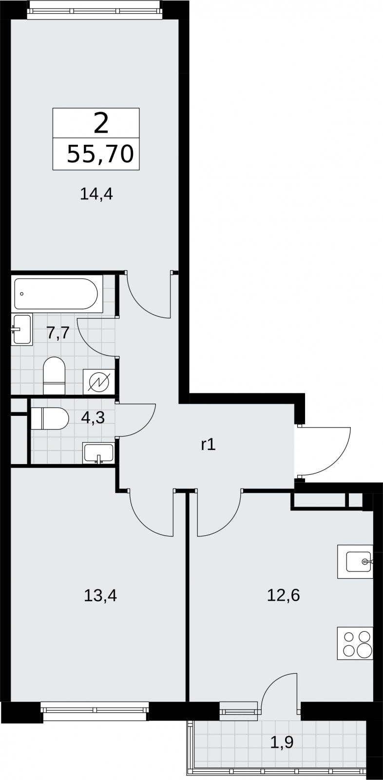 - Общая площадь 55.7 м²