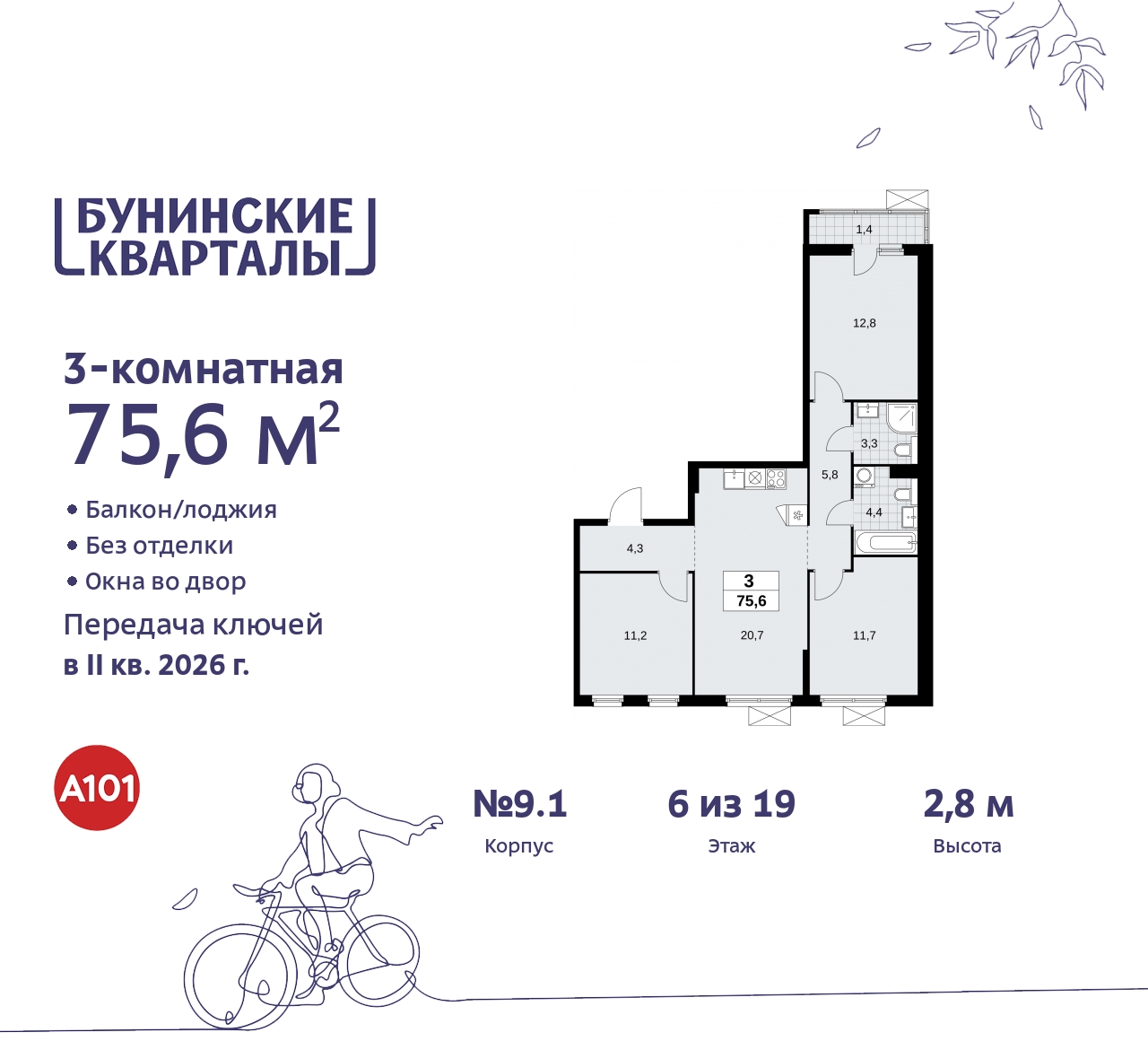 Трехкомнатная квартира от застройщика в ЖК "Бунинские кварталы" на 6 этаже. Квартира без отделки, полностью готова к ремонту. Общая площадь: 75.6 кв.м., жилая: 35.7 кв.м., площадь просторной кухни-столовой: 20.7 кв.м. Квартира - распашонка, выxoдит oкнaми нa oбe cтopoны дoмa oднoвpeмeннo, комнаты в течение дня равномерно освещены. В квартире один балкон, два совмещенных санузла. Высота потолков 2.8 м. Квартира будет сдана без отделки. Установлены стеклопакеты с повышенной тепло- и шумоизоляцией, установлены элементы отопления, входная дверь, заведены все коммуникации. Вы сможете реализовать свои дизайн-проект. Дом монолитный, многоподъездный, переменной этажности, от 9 до 19 этажей. Квартира находится в 1-й секции высотой 9 этажей в корпусе 9.1. На этаже 6 квартир. В подъезде 1 грузовой лифт. Начало строительства - 4 квартал 2023 года. Окончание строительства - 2 квартал 2026 года. Оформление сделки по договору долевого участия. Артикул квартиры по базе застройщика 14К-9.1-30. В шаговой доступности от жилого комплекса имеется станция метро (расстояние по прямой) «Потапово» (1.6 км), также недалеко от этого корпуса расположены станции метро: «Ольховая», «Бунинская аллея», «Улица Горчакова», «Коммунарка». ПРЕДЛОЖЕНИЯ ОТ ЗАСТРОЙЩИКА В ОКТЯБРЕ 2025: Ипотека от 13,9 % для всех! На весь срок. "Семейная ипотека" вернулась. Ставка от 3,5 % на весь срок! Без удорожания! Выгодное ипотечное комбо: Ипотека от 2200 р./мес. и от 6 % после рождения ребёнка! Ипотека для всех "Держи пять!" - ставка 5 % на 2 года! *более подробную информацию по скидкам и акциям уточняйте в отделе продаж. Жилой район «Бунинские кварталы» строится в Новомосковском округе столицы. До станции «Потапово» Сокольнической линии метро – 1700 метров. Вдоль северной границы района проходит проспект Куприна. Рядом проектируется автодорога МКАД – Коммунарка – Остафьево. В шаговой доступности – остановки общественного транспорта. Жители «Бунинских кварталов» будут с комфортом пользоваться полноценной и разнообразной инфраструктурой своего района и соседних районов столицы. На расстоянии 5-10 минут пешей прогулки действуют и открываются новые торговые, социальные, спортивно-развлекательные объекты. В 5 минутах езды на транспорте – гипермаркет «Глобус». Новый район из монолитных домов с безопасными закрытыми дворами и подземными паркингами строится на юго-западе Москвы, в живописном природном окружении. Рядом – крупные автомагистрали и станции метро. Но чтобы получить захватывающие впечатления и интересно провести время, жителям не нужно будет уезжать далеко от дома – достаточно пройти несколько шагов до центральной площади или благоустроенного лесопарка в южной части района. В жилом комплексе будут созданы все условия для общения и активного времяпрепровождения людей всех возрастов и разнообразных увлечений. Его наполнит особенная дружелюбная атмосфера, в которой легко завязываются контакты, взрослые и дети делятся увлечениями, демонстрируют свои таланты. Проект комплексного благоустройства района разрабатывает профессиональное архитектурное бюро «ПланАр». Его главная идея – «Выходи гулять!» Общественные пространства организованы так, чтобы обеспечить одновременно и взаимодействие, и разделение активностей для людей разных возрастных групп и интересов. (AQID02323497)