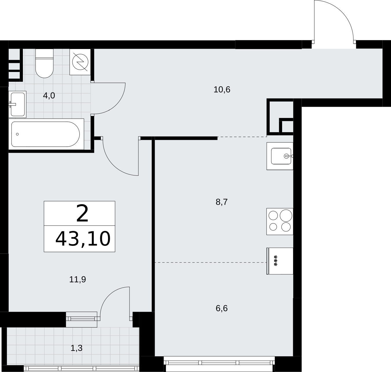 - Общая площадь 43.1 м²