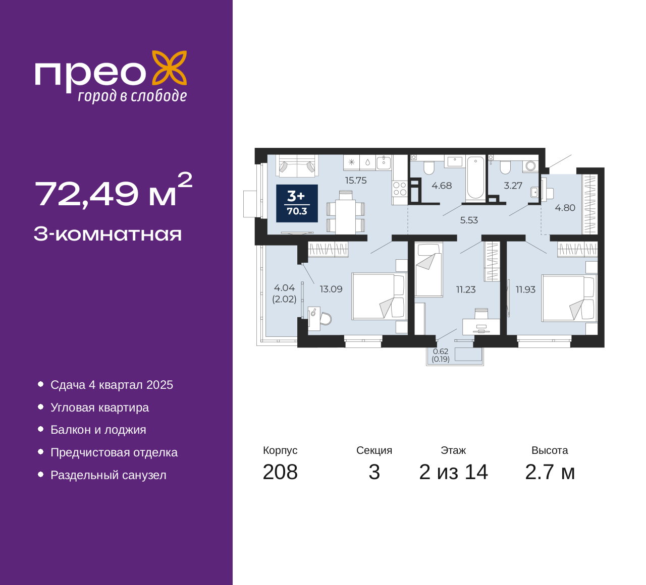 - Общая площадь 72.49 м²
