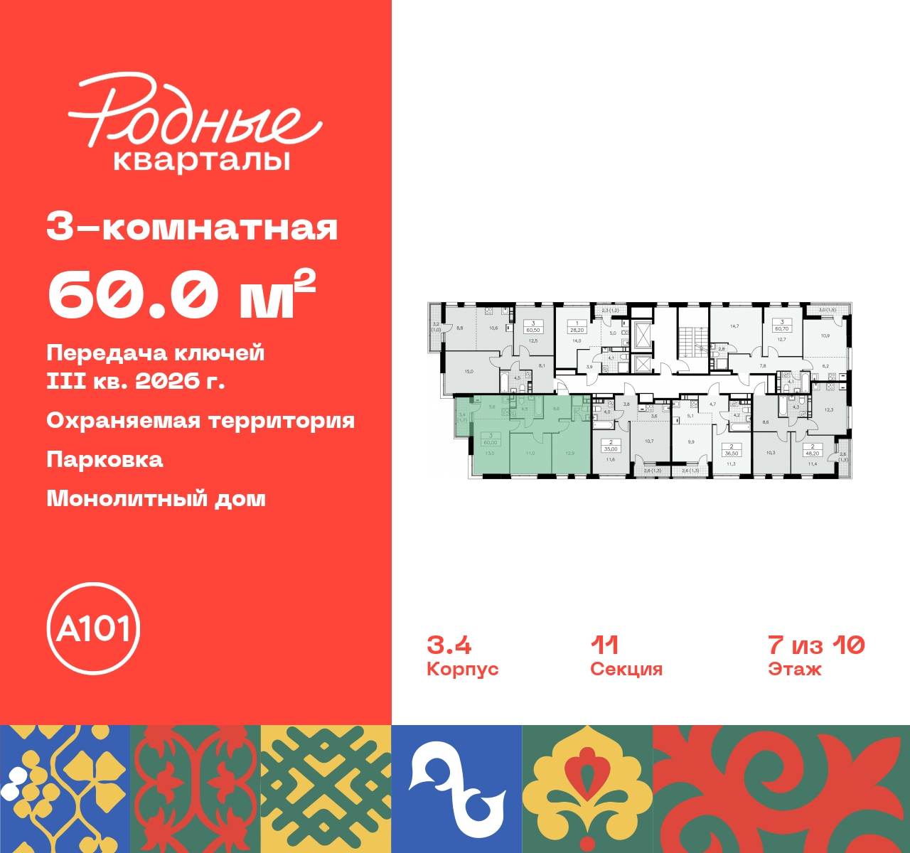 3-комн. квартира с европланировкой в ЖК "Родные кварталы" на 7 этаже. Квартира без отделки, полностью готова к ремонту. Общая площадь: 60 кв.м., жилая: 36.9 кв.м., суммарная площадь гостиной-столовой с кухонной зоной: 18.6 кв.м. Европланировка, за счет большой площади кухни-гостиной квартира выглядит просторной и очень удобна для жизни. Квартира угловая, окна oбecпeчивaют paвнoмepнoe ocвeщeниe в тeчeниe дня. В квартире один балкон, два совмещенных санузла. Высота потолков 2.95 м. Квартира находится в корпусе 3.4. Дом монолитный, одноподъездный, высотой 10 этажей. На этаже 7 квартир. В подъезде 1 пассажирский и 1 грузовой лифт. Начало строительства - 2 квартал 2024 года. Окончание строительства - 3 квартал 2026 года. Оформление сделки по договору долевого участия. Артикул квартиры по базе застройщика 96К-3.4-511. ПРЕДЛОЖЕНИЯ ОТ ЗАСТРОЙЩИКА В ОКТЯБРЕ 2025: Ипотека от 13,9 % для всех! На весь срок. "Семейная ипотека" вернулась. Ставка от 3,5 % на весь срок! Без удорожания! Выгодное ипотечное комбо: Ипотека от 2200 р./мес. и от 6 % после рождения ребёнка! Ипотека для всех "Держи пять!" - ставка 5 % на 2 года! *более подробную информацию по скидкам и акциям уточняйте в отделе продаж Новый жилой комплекс "Родные кварталы" строится в уютной, экологически благополучной локации на юго-западе столицы. В ближайшем окружении – ухоженные малоэтажные посёлки и живописный Ульяновский лесопарк. Благодаря этому из окон откроются вдохновляющие виды, которые не исчезнут со временем за фасадами многоэтажек. Через весь район пройдёт главный бульвар, который свяжет набережную, жилые кварталы и площади в единое дружелюбное пространство, органично наполненное узнаваемыми элементами культурных традиций разных народов. В жилом комплексе создаются условия для комфортного отдыха и занятий спортом всех жителей. Здесь можно прогуляться и отдохнуть в лесопарке на берегу ручья, позаниматься на тренажёрах под открытым небом и спортивных площадках. Для малышей построят игровые комплексы, развивающие силу, координацию и ловкость. Всего в жилом комплексе будет оборудовано 6 га территории для спокойного отдыха и около 9 га — для активного. Подъезды в домах освещены в любое время суток, входы и вестибюль хорошо просматриваются с улицы. Витражное остекление обеспечивает приток естественного света днём, а вечером зажигаются светильники. В отделке домов используется сочетание вентилируемого фасада с облицовкой из фибробетонной плитки и штукатуркой. Комфортная высота домов соразмерна человеку и в среднем составляет 10 этажей. Все дома обеспечены собственными подземными паркингами. В них размещаются машино-места и кладовые. В паркинг или кладовую можно спуститься на лифте или по лестнице. В комплексе появятся бытовые сервисы, магазины, аптеки и другие торгово-бытовые объекты. В жилом районе «Родные кварталы» будут построены: - образовательный центр: школа на 1300 учеников и детский сад на 250 малышей, - два детских сада на 200 мест каждый (один из них сдаётся в 1-й очереди). В транспортной доступности уже работают: - школа № 41 и детский сад — по Боровскому шоссе, - школа № 2057 и детский сад — на запад от района, в дер. Марушкино. ЖК «Родные кварталы» строится в Новомосковском округе столицы, в 15 минутах на автомобиле от аэропорта «Внуково». Район обеспечен удобными выездами на три крупные современные автотрассы. Здесь уже рабо