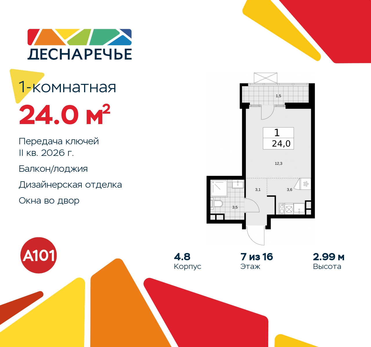 Продается однокомнатная квартира-студия с отделкой в ЖК "Деснаречье" на 7 этаже. Общая площадь: 24 кв.м., площадь гостиной 15.9 кв.м., из которых 3.6 кв.м. выделено под кухонную зону. Все окна выходят на одну сторону. В квартире один балкон, один совмещенный санузел. Высота потолков 2.99 м. Эта квартира будет сдана с дизайнеркой отделкой "под ключ". Специально для вас мы разработали несколько решений дизайнерской отделки. В отделке используются только современный высококлассные материалы, на все работы предоставляется гарантия. В таком случае вы оплачиваете отделку в сегодняшних ценах, а эту стоимость вы можете разнести в ипотечных платежах. Дом монолитный, многоподъездный, переменной этажности, от 7 до 16 этажей. Квартира находится в 3-й секции высотой 7 этажей в корпусе 4.8. На этаже 5 квартир. В подъезде 1 грузовой лифт. Начало строительства - 3 квартал 2023 года. Окончание строительства - 2 квартал 2026 года. Оформление сделки по договору долевого участия. Артикул квартиры по базе застройщика 88К-4.8-1888. ПРЕДЛОЖЕНИЯ ОТ ЗАСТРОЙЩИКА В ОКТЯБРЕ 2025: Ипотека от 13,9 % для всех! На весь срок. "Семейная ипотека" вернулась. Ставка от 3,5 % на весь срок! Без удорожания! Выгодное ипотечное комбо: Ипотека от 2200 р./мес. и от 6 % после рождения ребёнка! Ипотека для всех "Держи пять!" - ставка 5 % на 2 года! *более подробную информацию по скидкам и акциям уточняйте в отделе продаж Масштабный проект "Деснаречье" на юго-западе Москвы, который включает три новых района («квартала»), объединённые общей идеей – воплотить в реальность мечты современных жителей столицы об интересном, комфортном и разноплановом городском пространстве в окружении рек и лесов, словно сошедших с полотен русских живописцев: - «Берег» оценят все, кому близка водная стихия: плеск волн, солнечные блики и прогулки вдоль тихого течения речи. - «Лес» утопает в зелени парков и лесов. Здесь соблюдён идеальный баланс загородного спокойствия и столичного комфорта. - «Парк», самый энергичный и яркий, отличается высокой концентрацией пространств для спорта и творчества. Жилой комплекс "Деснаречье" расположится в 12 км от МКАД по современному Калужскому шоссе. Внешний облик зданий соответствует современному стилю и стандартам, характерным и для других популярных проектов ГК «А101»: сочетание контрастных тонов, большое количество остекления, в котором отражается небо, гармония с природным окружением. Весь город - в вашем районе. Находиться на территории «15-минутного города» значит иметь всё необходимое для полноценной жизни в шаговой доступности. Маршруты в районе «Деснаречье» выстроены так, чтобы добраться до магазинов, парков, школ, салонов услуг и других объектов можно было всего за несколько минут пешком или на велосипеде. Двор закрытый от машин – это тишина, комфорт и безопасность, поэтому все машино-места (включая «семейные» и увеличенные, с возможностью установки роллетных шкафов) находятся в подземном паркинге. В паркинги можно спуститься на лифте из любого подъезда или по лестнице. Рядом с «Деснаречьем» в 2027 году планируется открытие станции метро «Десна», до которой будет удобно добраться пешком или на велосипеде. Дорога на автомобиле до перехватывающих парковок станций «Ольховая» и «Прокшино» займёт около 10 минут. В процессе реализации проекта будут появляться новые маршруты общественного транспорта по р