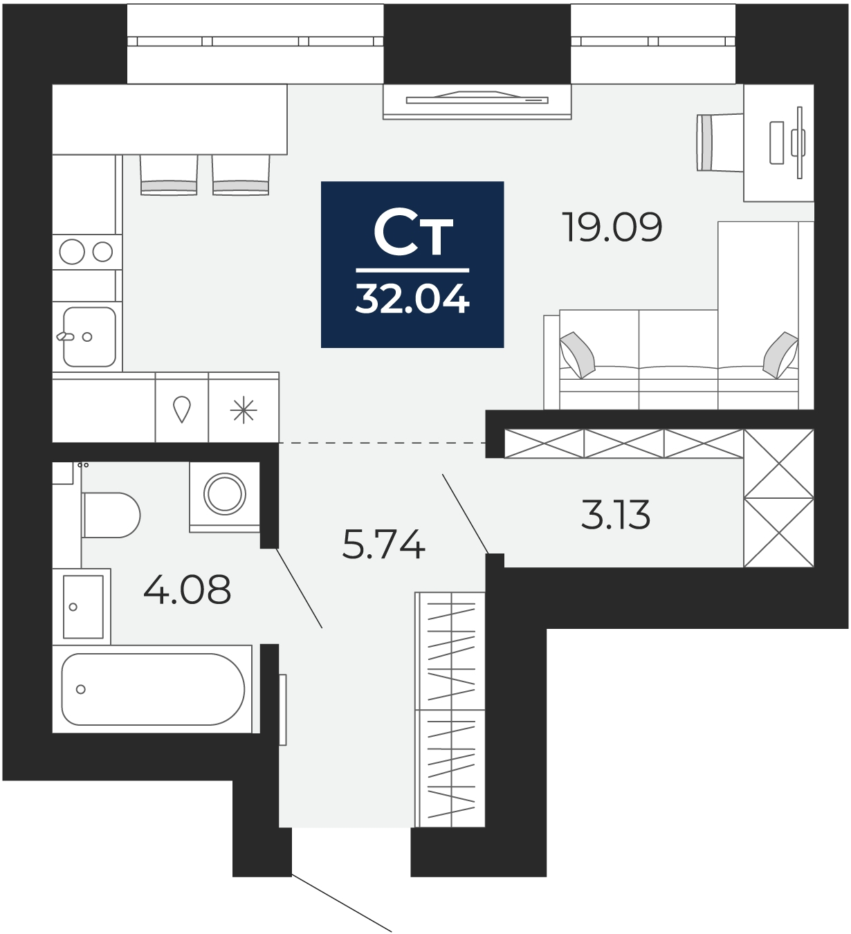 - Общая площадь 32.04 м²