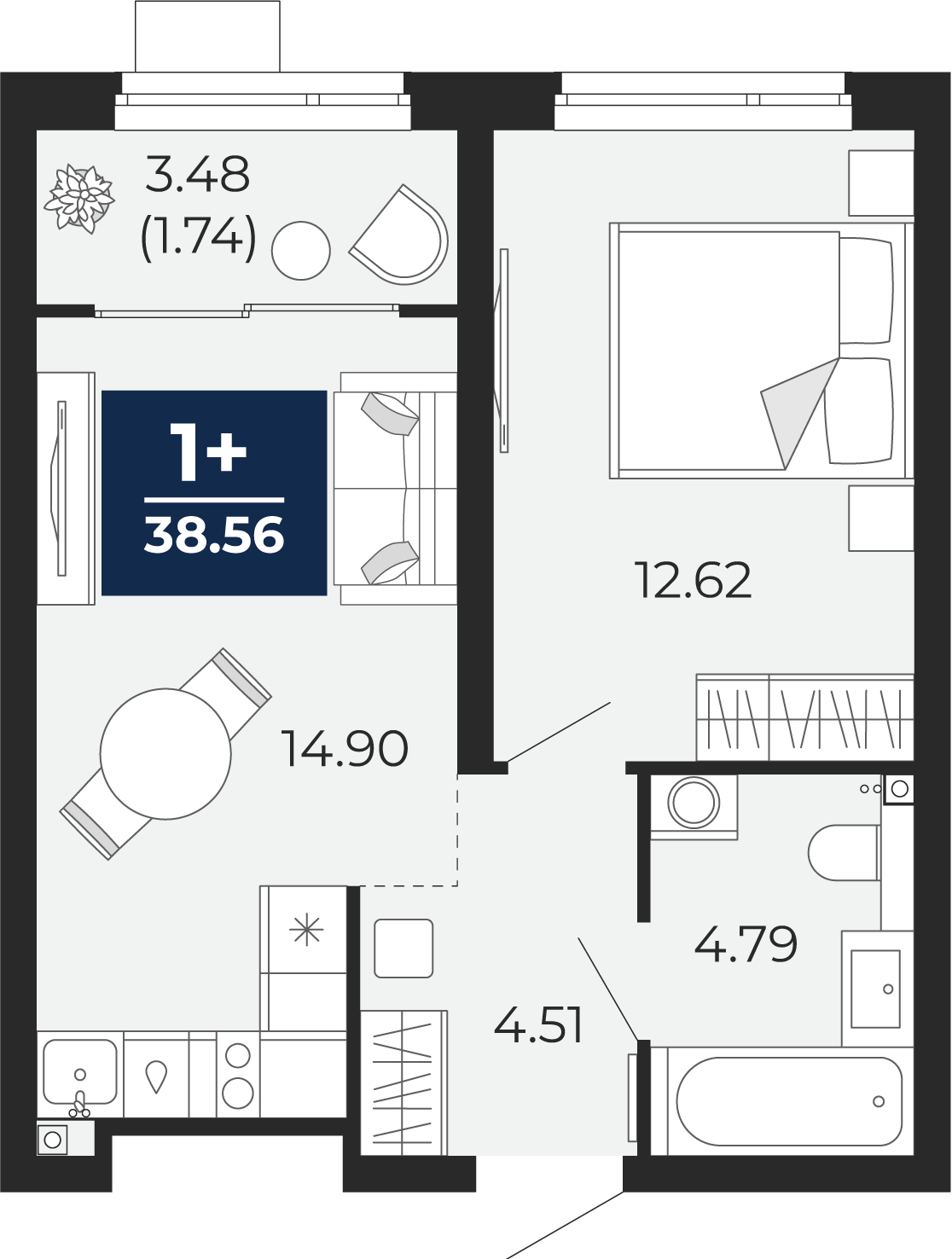 - Общая площадь 38.56 м²