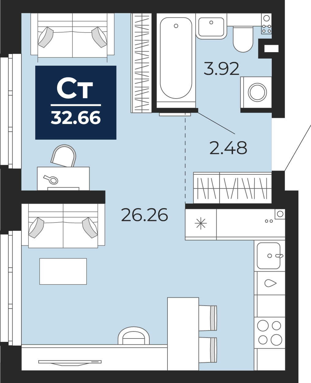 Просторная 1-комн. квартира-студия в ЖК "Беринг" на 1 этаже. Квартира без отделки, полностью готова к чистовой отделке и дальнейшему ремонту. Общая площадь: 32.66 кв.м., площадь гостиной 26.26 кв.м., из которых 5 кв.м. выделено под кухонную зону. Все окна выходят на одну сторону. В квартире один совмещенный санузел. Высота потолков 2.75 м. Дом монолитный, многоподъездный, переменной этажности, от 9 до 22 этажей. Квартира находится в 73.2-й секции высотой 22 этажа в корпусе ГП-73. На этаже 7 квартир. В подъезде 1 пассажирский и 1 грузовой лифт. Окончание строительства - 4 квартал 2025 года. Оформление сделки по договору долевого участия. Подобно знаменитому исследователю, мы чувствуем себя первооткрывателями этой локации. Хотим показать новую суть места, сформировать для вас жизненный опыт, которого ещё не было. Беринг — район зелёного цвета. Беринг — район, который откроется вам с другой стороны. Впечатлит новым уровнем комфорта и качеством жизни. Беринг — открытие на карте города. Первый квартал расположен в районе Тура, в границах улиц: Камчатская – Западносибирская – Энтузиастов. Вокруг уже есть всё для того, чтобы ежедневная рутина была лишь частью жизни и не доставляла дискомфорта. Школы и детские сады, магазины и аптеки, поликлиника, места для семейного отдыха, пеших и велопрогулок, и даже рыбалки. Масштабное озеленение дворов — визитная карточка ЭНКО и ваш оазис спокойствия, чтобы отвлечься от повседневности. Раскидистые деревья, кустарники, травы и цветы — осталось остановиться, вдохнуть и расслабиться, глядя на эту природную красоту. Стилистика подъездов продолжает концепцию Беринга, вдохновлённого Камчаткой: сдержанный, но при этом впечатляющий дизайн соседствует с удобством и функциональностью. (AQID02315550)