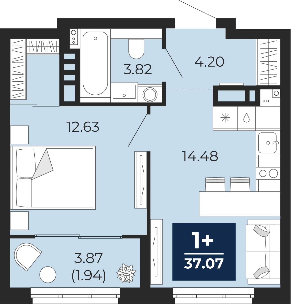 - Общая площадь 37.07 м²