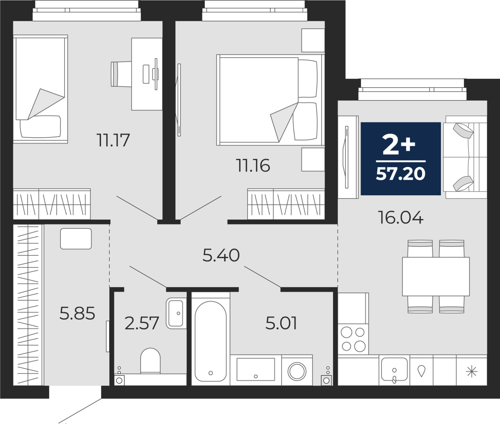 - Общая площадь 57.2 м²