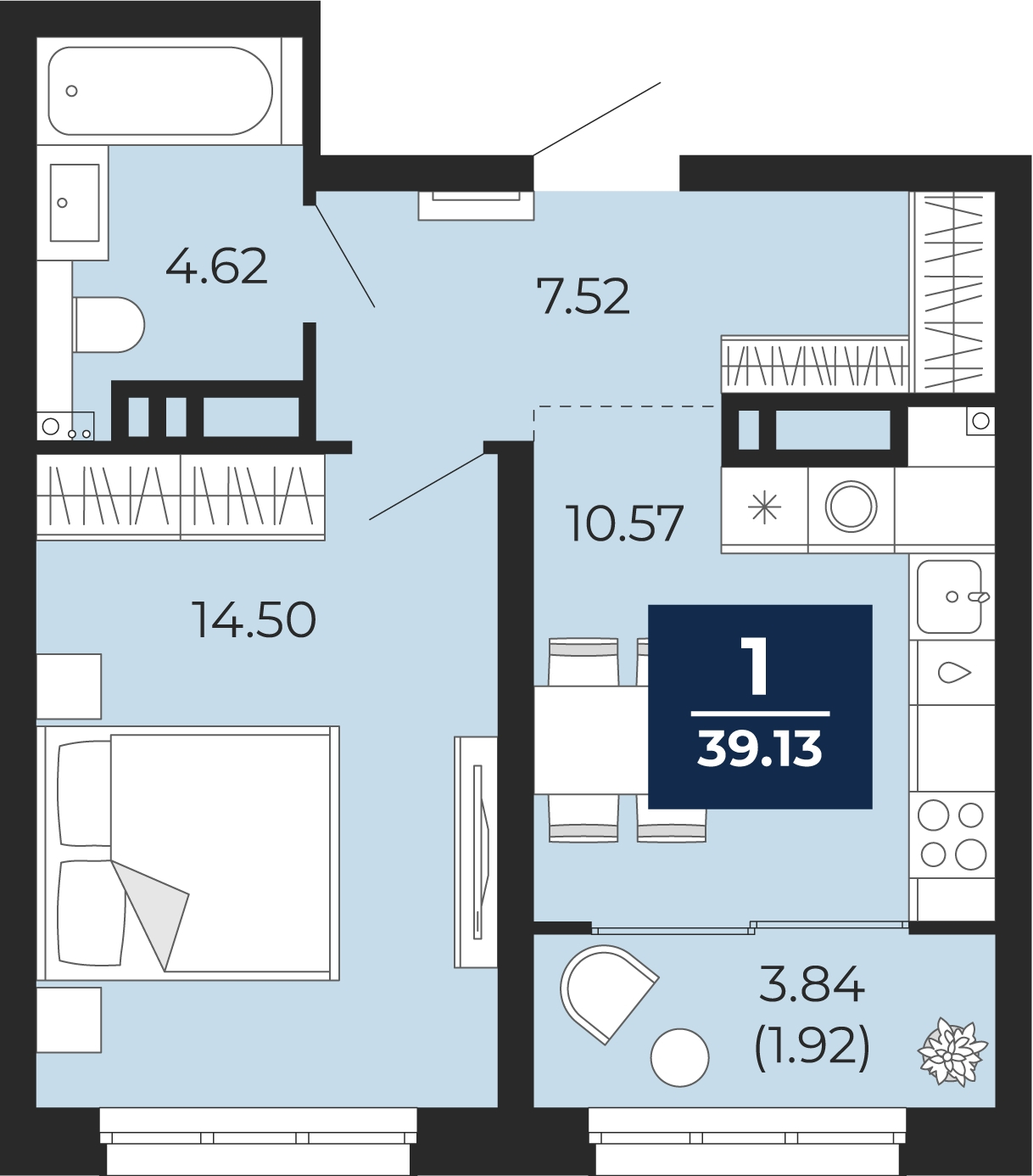 - Общая площадь 39.13 м²