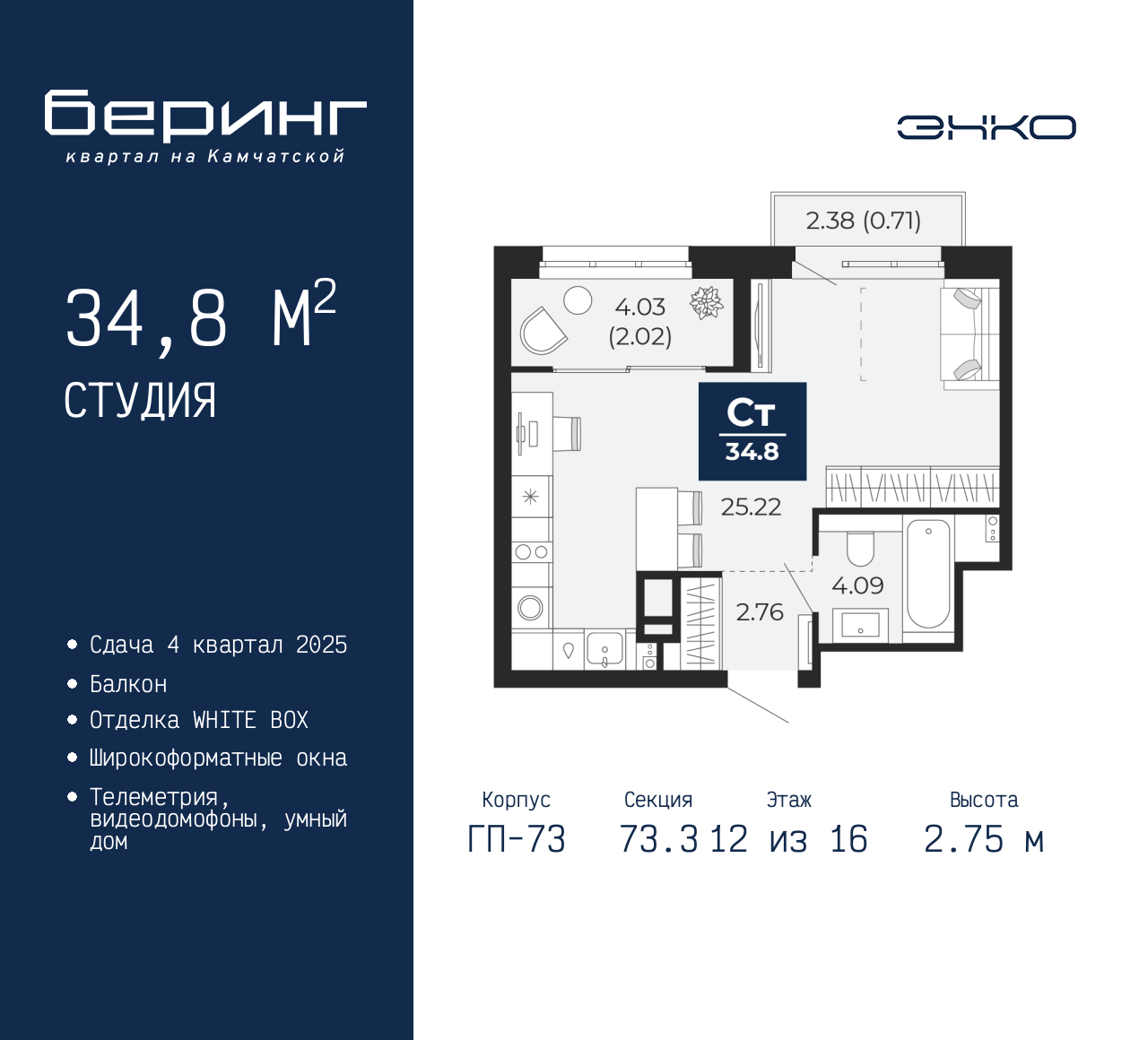 Однокомнатная квартира-студия от застройщика в ЖК "Беринг" на 12 этаже. Квартира без отделки, новый собственник может сделать ремонт по индивидуальному проекту. Общая площадь: 34.8 кв.м., площадь гостиной 25.22 кв.м., из которых 5 кв.м. выделено под кухонную зону. Все окна выходят на одну сторону. В квартире один балкон, один совмещенный санузел. Высота потолков 2.75 м. Дом монолитный, многоподъездный, переменной этажности, от 9 до 22 этажей. Квартира находится в 73.3-й секции высотой 16 этажей в корпусе ГП-73. На этаже 8 квартир. В подъезде 1 пассажирский и 1 грузовой лифт. Окончание строительства - 4 квартал 2025 года. Оформление сделки по договору долевого участия. Подобно знаменитому исследователю, мы чувствуем себя первооткрывателями этой локации. Хотим показать новую суть места, сформировать для вас жизненный опыт, которого ещё не было. Беринг — район зелёного цвета. Беринг — район, который откроется вам с другой стороны. Впечатлит новым уровнем комфорта и качеством жизни. Беринг — открытие на карте города. Первый квартал расположен в районе Тура, в границах улиц: Камчатская – Западносибирская – Энтузиастов. Вокруг уже есть всё для того, чтобы ежедневная рутина была лишь частью жизни и не доставляла дискомфорта. Школы и детские сады, магазины и аптеки, поликлиника, места для семейного отдыха, пеших и велопрогулок, и даже рыбалки. Масштабное озеленение дворов — визитная карточка ЭНКО и ваш оазис спокойствия, чтобы отвлечься от повседневности. Раскидистые деревья, кустарники, травы и цветы — осталось остановиться, вдохнуть и расслабиться, глядя на эту природную красоту. Стилистика подъездов продолжает концепцию Беринга, вдохновлённого Камчаткой: сдержанный, но при этом впечатляющий дизайн соседствует с удобством и функциональностью. (AQID02315566)
