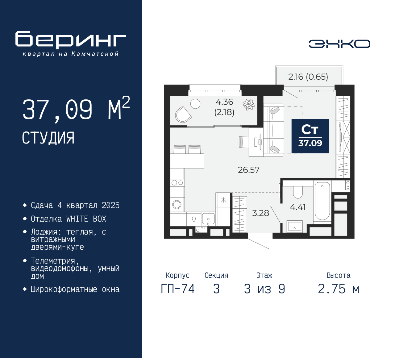 1-комн. квартира-студия от застройщика в ЖК "Беринг" на 3 этаже. Квартира без отделки, после получения ключей можно делать ремонт. Общая площадь: 37.09 кв.м., площадь гостиной 26.57 кв.м., из которых 5 кв.м. выделено под кухонную зону. Все окна выходят на одну сторону. В квартире один балкон и одна лоджия, один совмещенный санузел. Высота потолков 2.75 м. Дом монолитный, многоподъездный, переменной этажности, от 9 до 21 этажей. Квартира находится в 3-й секции высотой 9 этажей в корпусе ГП-74. На этаже 7 квартир. В подъезде 1 грузовой лифт. Окончание строительства - 4 квартал 2025 года. Оформление сделки по договору долевого участия. Подобно знаменитому исследователю, мы чувствуем себя первооткрывателями этой локации. Хотим показать новую суть места, сформировать для вас жизненный опыт, которого ещё не было. Беринг — район зелёного цвета. Беринг — район, который откроется вам с другой стороны. Впечатлит новым уровнем комфорта и качеством жизни. Беринг — открытие на карте города. Первый квартал расположен в районе Тура, в границах улиц: Камчатская – Западносибирская – Энтузиастов. Вокруг уже есть всё для того, чтобы ежедневная рутина была лишь частью жизни и не доставляла дискомфорта. Школы и детские сады, магазины и аптеки, поликлиника, места для семейного отдыха, пеших и велопрогулок, и даже рыбалки. Масштабное озеленение дворов — визитная карточка ЭНКО и ваш оазис спокойствия, чтобы отвлечься от повседневности. Раскидистые деревья, кустарники, травы и цветы — осталось остановиться, вдохнуть и расслабиться, глядя на эту природную красоту. Стилистика подъездов продолжает концепцию Беринга, вдохновлённого Камчаткой: сдержанный, но при этом впечатляющий дизайн соседствует с удобством и функциональностью. (AQID02315699)