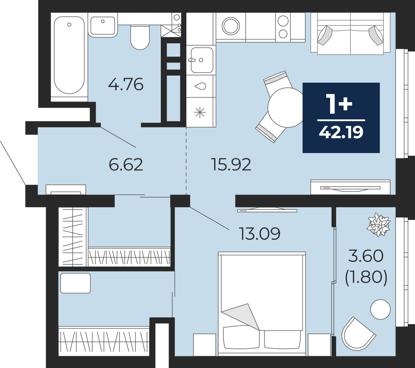 - Общая площадь 42.19 м²