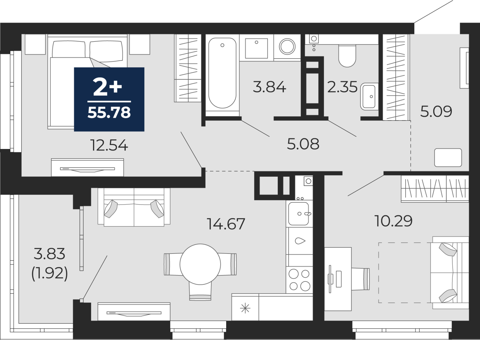 - Общая площадь 55.78 м²