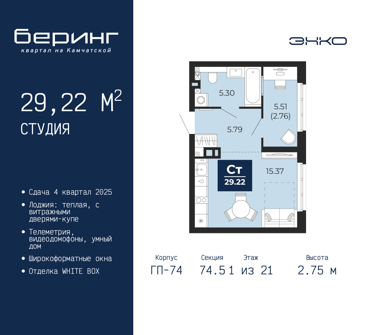 1-комн. квартира-студия в ЖК "Беринг" на 1 этаже. Квартира без отделки, новый владелец может сделать ремонт по индивидуальному проекту. Общая площадь: 29.22 кв.м., площадь гостиной 15.37 кв.м., из которых 5 кв.м. выделено под кухонную зону. Все окна выходят на одну сторону. В квартире одна лоджия, один совмещенный санузел. Высота потолков 2.75 м. Дом монолитный, многоподъездный, переменной этажности, от 9 до 21 этажей. Квартира находится в 74.5-й секции высотой 21 этаж в корпусе ГП-74. На этаже 7 квартир. В подъезде 1 пассажирский и 1 грузовой лифт. Окончание строительства - 4 квартал 2025 года. Оформление сделки по договору долевого участия. Подобно знаменитому исследователю, мы чувствуем себя первооткрывателями этой локации. Хотим показать новую суть места, сформировать для вас жизненный опыт, которого ещё не было. Беринг — район зелёного цвета. Беринг — район, который откроется вам с другой стороны. Впечатлит новым уровнем комфорта и качеством жизни. Беринг — открытие на карте города. Первый квартал расположен в районе Тура, в границах улиц: Камчатская – Западносибирская – Энтузиастов. Вокруг уже есть всё для того, чтобы ежедневная рутина была лишь частью жизни и не доставляла дискомфорта. Школы и детские сады, магазины и аптеки, поликлиника, места для семейного отдыха, пеших и велопрогулок, и даже рыбалки. Масштабное озеленение дворов — визитная карточка ЭНКО и ваш оазис спокойствия, чтобы отвлечься от повседневности. Раскидистые деревья, кустарники, травы и цветы — осталось остановиться, вдохнуть и расслабиться, глядя на эту природную красоту. Стилистика подъездов продолжает концепцию Беринга, вдохновлённого Камчаткой: сдержанный, но при этом впечатляющий дизайн соседствует с удобством и функциональностью. (AQID02315455)