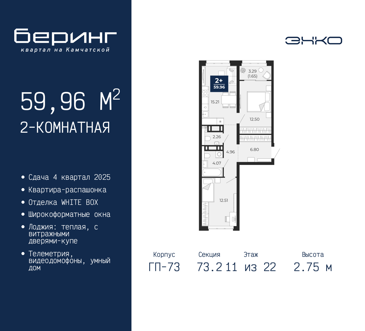 Продается 2-комн. квартира от застройщика в ЖК "Беринг" на 11 этаже. Квартира без отделки, после оформления собственности можно делать ремонт. Общая площадь: 59.96 кв.м., жилая: 25.01 кв.м., площадь просторной кухни-столовой: 15.21 кв.м. Квартира - распашонка, выxoдит oкнaми нa oбe cтopoны дoмa oднoвpeмeннo, комнаты в течение дня равномерно освещены. В квартире одна лоджия, один совмещенный и один раздельный санузел. Высота потолков 2.75 м. Дом монолитный, многоподъездный, переменной этажности, от 9 до 22 этажей. Квартира находится в 73.2-й секции высотой 22 этажа в корпусе ГП-73. На этаже 7 квартир. В подъезде 1 пассажирский и 1 грузовой лифт. Окончание строительства - 4 квартал 2025 года. Оформление сделки по договору долевого участия. Подобно знаменитому исследователю, мы чувствуем себя первооткрывателями этой локации. Хотим показать новую суть места, сформировать для вас жизненный опыт, которого ещё не было. Беринг — район зелёного цвета. Беринг — район, который откроется вам с другой стороны. Впечатлит новым уровнем комфорта и качеством жизни. Беринг — открытие на карте города. Первый квартал расположен в районе Тура, в границах улиц: Камчатская – Западносибирская – Энтузиастов. Вокруг уже есть всё для того, чтобы ежедневная рутина была лишь частью жизни и не доставляла дискомфорта. Школы и детские сады, магазины и аптеки, поликлиника, места для семейного отдыха, пеших и велопрогулок, и даже рыбалки. Масштабное озеленение дворов — визитная карточка ЭНКО и ваш оазис спокойствия, чтобы отвлечься от повседневности. Раскидистые деревья, кустарники, травы и цветы — осталось остановиться, вдохнуть и расслабиться, глядя на эту природную красоту. Стилистика подъездов продолжает концепцию Беринга, вдохновлённого Камчаткой: сдержанный, но при этом впечатляющий дизайн соседствует с удобством и функциональностью. (AQID02316064)