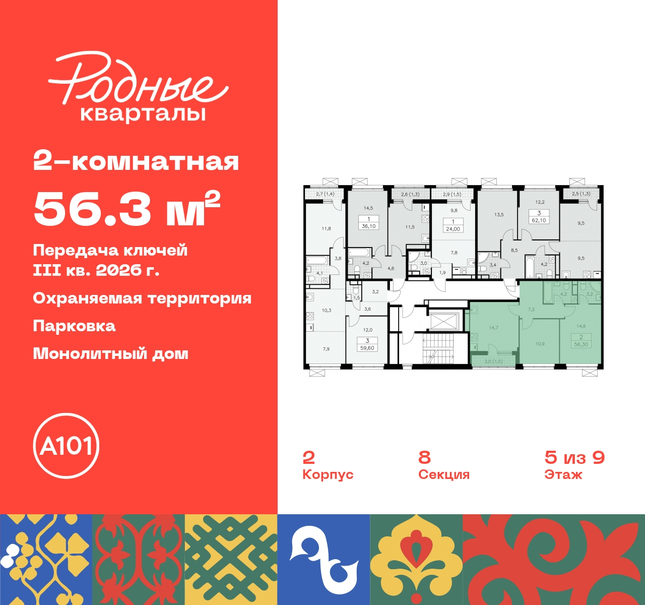 Просторная двухкомнатная квартира в ЖК "Родные кварталы" на 5 этаже. Квартира без отделки, полностью готова к ремонту. Общая площадь: 56.3 кв.м., жилая: 25.5 кв.м., площадь просторной кухни-столовой: 14.7 кв.м. Комнаты изолированные, все окна выходят на одну сторону. В квартире одна лоджия, два совмещенных санузла. Высота потолков 2.9 м. Дом монолитный, многоподъездный, высотой 9 этажей. Квартира находится в 8-й секции в корпусе 2. На этаже 5 квартир. В подъезде 1 грузовой лифт. Начало строительства - 4 квартал 2023 года. Окончание строительства - 3 квартал 2026 года. Оформление сделки по договору долевого участия. Артикул квартиры по базе застройщика 96К-2-356. ПРЕДЛОЖЕНИЯ ОТ ЗАСТРОЙЩИКА В ОКТЯБРЕ 2025: Ипотека от 13,9 % для всех! На весь срок. "Семейная ипотека" вернулась. Ставка от 3,5 % на весь срок! Без удорожания! Выгодное ипотечное комбо: Ипотека от 2200 р./мес. и от 6 % после рождения ребёнка! Ипотека для всех "Держи пять!" - ставка 5 % на 2 года! *более подробную информацию по скидкам и акциям уточняйте в отделе продаж Новый жилой комплекс "Родные кварталы" строится в уютной, экологически благополучной локации на юго-западе столицы. В ближайшем окружении – ухоженные малоэтажные посёлки и живописный Ульяновский лесопарк. Благодаря этому из окон откроются вдохновляющие виды, которые не исчезнут со временем за фасадами многоэтажек. Через весь район пройдёт главный бульвар, который свяжет набережную, жилые кварталы и площади в единое дружелюбное пространство, органично наполненное узнаваемыми элементами культурных традиций разных народов. В жилом комплексе создаются условия для комфортного отдыха и занятий спортом всех жителей. Здесь можно прогуляться и отдохнуть в лесопарке на берегу ручья, позаниматься на тренажёрах под открытым небом и спортивных площадках. Для малышей построят игровые комплексы, развивающие силу, координацию и ловкость. Всего в жилом комплексе будет оборудовано 6 га территории для спокойного отдыха и около 9 га — для активного. Подъезды в домах освещены в любое время суток, входы и вестибюль хорошо просматриваются с улицы. Витражное остекление обеспечивает приток естественного света днём, а вечером зажигаются светильники. В отделке домов используется сочетание вентилируемого фасада с облицовкой из фибробетонной плитки и штукатуркой. Комфортная высота домов соразмерна человеку и в среднем составляет 10 этажей. Все дома обеспечены собственными подземными паркингами. В них размещаются машино-места и кладовые. В паркинг или кладовую можно спуститься на лифте или по лестнице. В комплексе появятся бытовые сервисы, магазины, аптеки и другие торгово-бытовые объекты. В жилом районе «Родные кварталы» будут построены: - образовательный центр: школа на 1300 учеников и детский сад на 250 малышей, - два детских сада на 200 мест каждый (один из них сдаётся в 1-й очереди). В транспортной доступности уже работают: - школа № 41 и детский сад — по Боровскому шоссе, - школа № 2057 и детский сад — на запад от района, в дер. Марушкино. ЖК «Родные кварталы» строится в Новомосковском округе столицы, в 15 минутах на автомобиле от аэропорта «Внуково». Район обеспечен удобными выездами на три крупные современные автотрассы. Здесь уже работает и активно развивается система наземного общественного транспорта, включая междугородние рейсы. Интенсивное развитие локации обеспечи