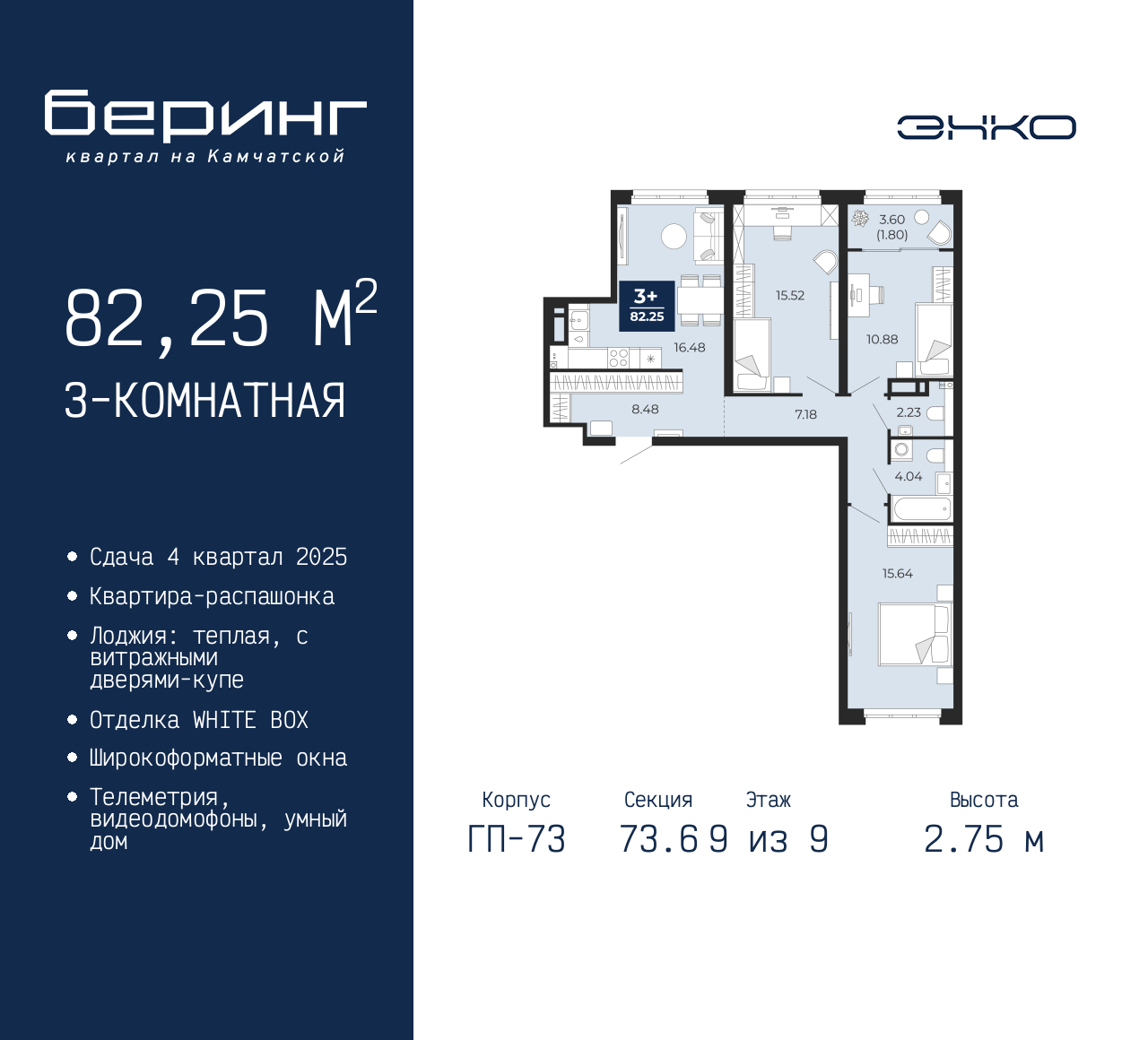Трехкомнатная квартира от застройщика в ЖК "Беринг" на 9 этаже. Квартира без отделки, после оформления собственности можно делать ремонт. Общая площадь: 82.25 кв.м., жилая: 42.04 кв.м., площадь просторной кухни-столовой: 16.48 кв.м. Квартира - распашонка, без проходных комнат, окна выходят на paзные стороны дома. В квартире одна лоджия, один совмещенный и один раздельный санузел. Высота потолков 2.75 м. Дом монолитный, многоподъездный, переменной этажности, от 9 до 22 этажей. Квартира находится в 73.6-й секции высотой 9 этажей в корпусе ГП-73. На этаже 5 квартир. В подъезде 1 пассажирский и 1 грузовой лифт. Окончание строительства - 4 квартал 2025 года. Оформление сделки по договору долевого участия. Подобно знаменитому исследователю, мы чувствуем себя первооткрывателями этой локации. Хотим показать новую суть места, сформировать для вас жизненный опыт, которого ещё не было. Беринг — район зелёного цвета. Беринг — район, который откроется вам с другой стороны. Впечатлит новым уровнем комфорта и качеством жизни. Беринг — открытие на карте города. Первый квартал расположен в районе Тура, в границах улиц: Камчатская – Западносибирская – Энтузиастов. Вокруг уже есть всё для того, чтобы ежедневная рутина была лишь частью жизни и не доставляла дискомфорта. Школы и детские сады, магазины и аптеки, поликлиника, места для семейного отдыха, пеших и велопрогулок, и даже рыбалки. Масштабное озеленение дворов — визитная карточка ЭНКО и ваш оазис спокойствия, чтобы отвлечься от повседневности. Раскидистые деревья, кустарники, травы и цветы — осталось остановиться, вдохнуть и расслабиться, глядя на эту природную красоту. Стилистика подъездов продолжает концепцию Беринга, вдохновлённого Камчаткой: сдержанный, но при этом впечатляющий дизайн соседствует с удобством и функциональностью. (AQID02316317)