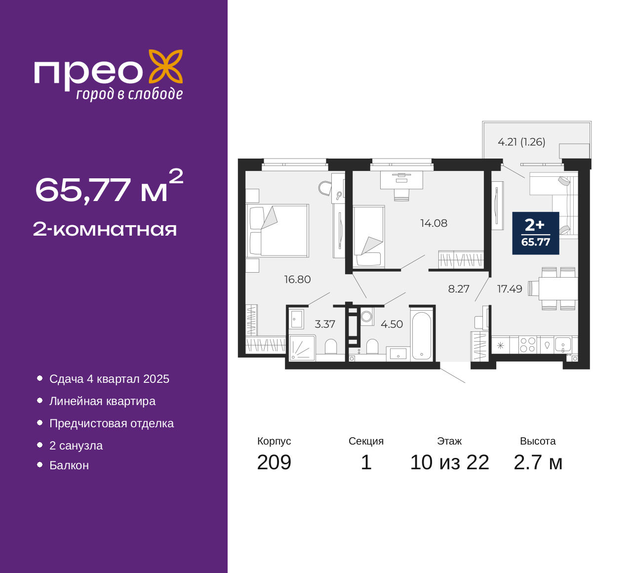 2-комн. квартира с предчистовой отделкой в ЖК "Прео" на 10 этаже. Общая площадь: 65.77 кв.м., жилая: 30.88 кв.м., площадь просторной кухни-столовой: 17.49 кв.м. Комнаты изолированные, все окна выходят на одну сторону. В квартире один балкон, два совмещенных санузла. Высота потолков 2.7 м. Квартира находится в корпусе 209. Дом монолитный, одноподъездный, высотой 22 этажа. На этаже 8 квартир. В подъезде 1 пассажирский и 1 грузовой лифт. Окончание строительства - 4 квартал 2025 года. Оформление сделки по договору долевого участия. Преображенский — один из самых привлекательных районов для жизни! Это полностью самостоятельный жилой район с точки зрения инфраструктуры. Преображенский находится между Московским и Червишевским трактами в квартале улиц Закалужская — Вьюжная — Александра Протозанова. Не нужно ждать, когда появится инфраструктура — переезжайте на всё готовое. Вблизи расположены действующие школа и детский сад. В этом году откроется еще один сад, а в следующем году — школа. По соседству с Преображенским запланировано строительство городского парка «Комарово» площадью 38 гектар. За 10 минут можно доехать на автомобиле до крупных ТРЦ: «Лента», «Кристалл», «Леруа Мерлен», «Метро» и «Ашан». С 2018 года в районе открыт Соседский центр — пространство, созданное для формирования добрососедской среды, совместного досуга, общения и реализации соседских инициатив. Здесь проходят встречи соседей, а также сами жители района организовывают мероприятия. Организатором такого события может стать любой желающий. В квартирах выполнена качественная предчистовая отделка. Гладкие стены с финишным выравниванием по маякам. Ровный потолок для установки натяжного потолка. Установлены пятикамерные окна с двойным стеклопакетом (3 стекла). Дизайнерские холлы с видеонаблюдением, безбарьерным и прозрачным входом – всегда светло и спокойно. На первом этаже есть просторные колясочные, где все жители могут оставлять свои коляски и велосипеды. В Преображенском есть всё, что нужно для активного отдыха и занятий спортом. Мы сделали большое футбольное поле с безопасным покрытием. Также установили хоккейный корт, который оборудован по всем необходимым стандартам. Во дворах можно делать упражнения на специальных площадках с турниками. Весь район мы обустроили велодорожками, которые связаны в единый маршрут. У нас есть сухие фонтаны, бьющие из земли, деревья, веревки, сетки, скалодром, газон, песок и резинка — осталось просто дать своему ребенку право на свободную игру. По-настоящему хорошие дворы — это те, которые дети предпочитают соцсетям и телевизору. Аккредитация в банках: ПАО Банк «ВТБ», ОАО «Альфа-Банк», «Сбербанк России», ПАО «Газпромбанк», ПАО «Банк Уралсиб» и других. (AQID02355930)