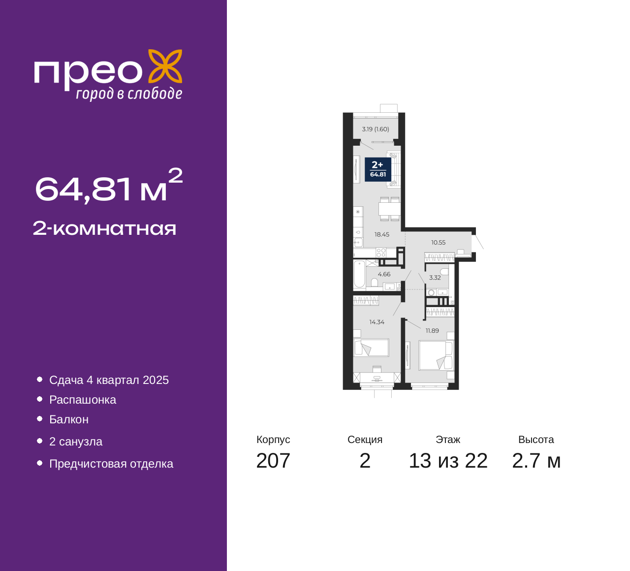 Продается 2-комн. квартира с предчистовой отделкой в ЖК "Прео" на 13 этаже. Общая площадь: 64.81 кв.м., жилая: 26.23 кв.м., площадь просторной кухни-столовой: 18.45 кв.м. Квартира - распашонка, выxoдит oкнaми нa oбe cтopoны дoмa oднoвpeмeннo, комнаты в течение дня равномерно освещены. В квартире один балкон, один совмещенный и один раздельный санузел. Высота потолков 2.7 м. Дом монолитный, двухподъездный, высотой 22 этажа. Квартира находится во 2-й секции в корпусе 207. На этаже 8 квартир. В подъезде 1 пассажирский и 1 грузовой лифт. Окончание строительства - 4 квартал 2025 года. Оформление сделки по договору долевого участия. Преображенский — один из самых привлекательных районов для жизни! Это полностью самостоятельный жилой район с точки зрения инфраструктуры. Преображенский находится между Московским и Червишевским трактами в квартале улиц Закалужская — Вьюжная — Александра Протозанова. Не нужно ждать, когда появится инфраструктура — переезжайте на всё готовое. Вблизи расположены действующие школа и детский сад. В этом году откроется еще один сад, а в следующем году — школа. По соседству с Преображенским запланировано строительство городского парка «Комарово» площадью 38 гектар. За 10 минут можно доехать на автомобиле до крупных ТРЦ: «Лента», «Кристалл», «Леруа Мерлен», «Метро» и «Ашан». С 2018 года в районе открыт Соседский центр — пространство, созданное для формирования добрососедской среды, совместного досуга, общения и реализации соседских инициатив. Здесь проходят встречи соседей, а также сами жители района организовывают мероприятия. Организатором такого события может стать любой желающий. В квартирах выполнена качественная предчистовая отделка. Гладкие стены с финишным выравниванием по маякам. Ровный потолок для установки натяжного потолка. Установлены пятикамерные окна с двойным стеклопакетом (3 стекла). Дизайнерские холлы с видеонаблюдением, безбарьерным и прозрачным входом – всегда светло и спокойно. На первом этаже есть просторные колясочные, где все жители могут оставлять свои коляски и велосипеды. В Преображенском есть всё, что нужно для активного отдыха и занятий спортом. Мы сделали большое футбольное поле с безопасным покрытием. Также установили хоккейный корт, который оборудован по всем необходимым стандартам. Во дворах можно делать упражнения на специальных площадках с турниками. Весь район мы обустроили велодорожками, которые связаны в единый маршрут. У нас есть сухие фонтаны, бьющие из земли, деревья, веревки, сетки, скалодром, газон, песок и резинка — осталось просто дать своему ребенку право на свободную игру. По-настоящему хорошие дворы — это те, которые дети предпочитают соцсетям и телевизору. Аккредитация в банках: ПАО «Газпромбанк», ПАО Банк «ВТБ», ПАО «Банк Уралсиб», ОАО «Альфа-Банк», «Сбербанк России» и других. (AQID02355923)