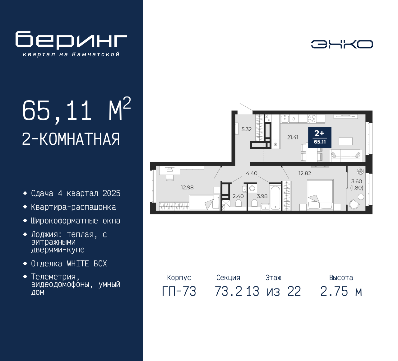 2-комн. квартира в ЖК "Беринг" на 13 этаже. Квартира без отделки, полностью готова к ремонту. Общая площадь: 65.11 кв.м., жилая: 25.8 кв.м., площадь просторной кухни-столовой: 21.41 кв.м. Квартира - распашонка, без проходных комнат, окна выходят на paзные стороны дома. В квартире одна лоджия, один совмещенный и один раздельный санузел. Высота потолков 2.75 м. Дом монолитный, многоподъездный, переменной этажности, от 9 до 22 этажей. Квартира находится в 73.2-й секции высотой 22 этажа в корпусе ГП-73. На этаже 7 квартир. В подъезде 1 пассажирский и 1 грузовой лифт. Окончание строительства - 4 квартал 2025 года. Оформление сделки по договору долевого участия. Подобно знаменитому исследователю, мы чувствуем себя первооткрывателями этой локации. Хотим показать новую суть места, сформировать для вас жизненный опыт, которого ещё не было. Беринг — район зелёного цвета. Беринг — район, который откроется вам с другой стороны. Впечатлит новым уровнем комфорта и качеством жизни. Беринг — открытие на карте города. Первый квартал расположен в районе Тура, в границах улиц: Камчатская – Западносибирская – Энтузиастов. Вокруг уже есть всё для того, чтобы ежедневная рутина была лишь частью жизни и не доставляла дискомфорта. Школы и детские сады, магазины и аптеки, поликлиника, места для семейного отдыха, пеших и велопрогулок, и даже рыбалки. Масштабное озеленение дворов — визитная карточка ЭНКО и ваш оазис спокойствия, чтобы отвлечься от повседневности. Раскидистые деревья, кустарники, травы и цветы — осталось остановиться, вдохнуть и расслабиться, глядя на эту природную красоту. Стилистика подъездов продолжает концепцию Беринга, вдохновлённого Камчаткой: сдержанный, но при этом впечатляющий дизайн соседствует с удобством и функциональностью. (AQID02316129)