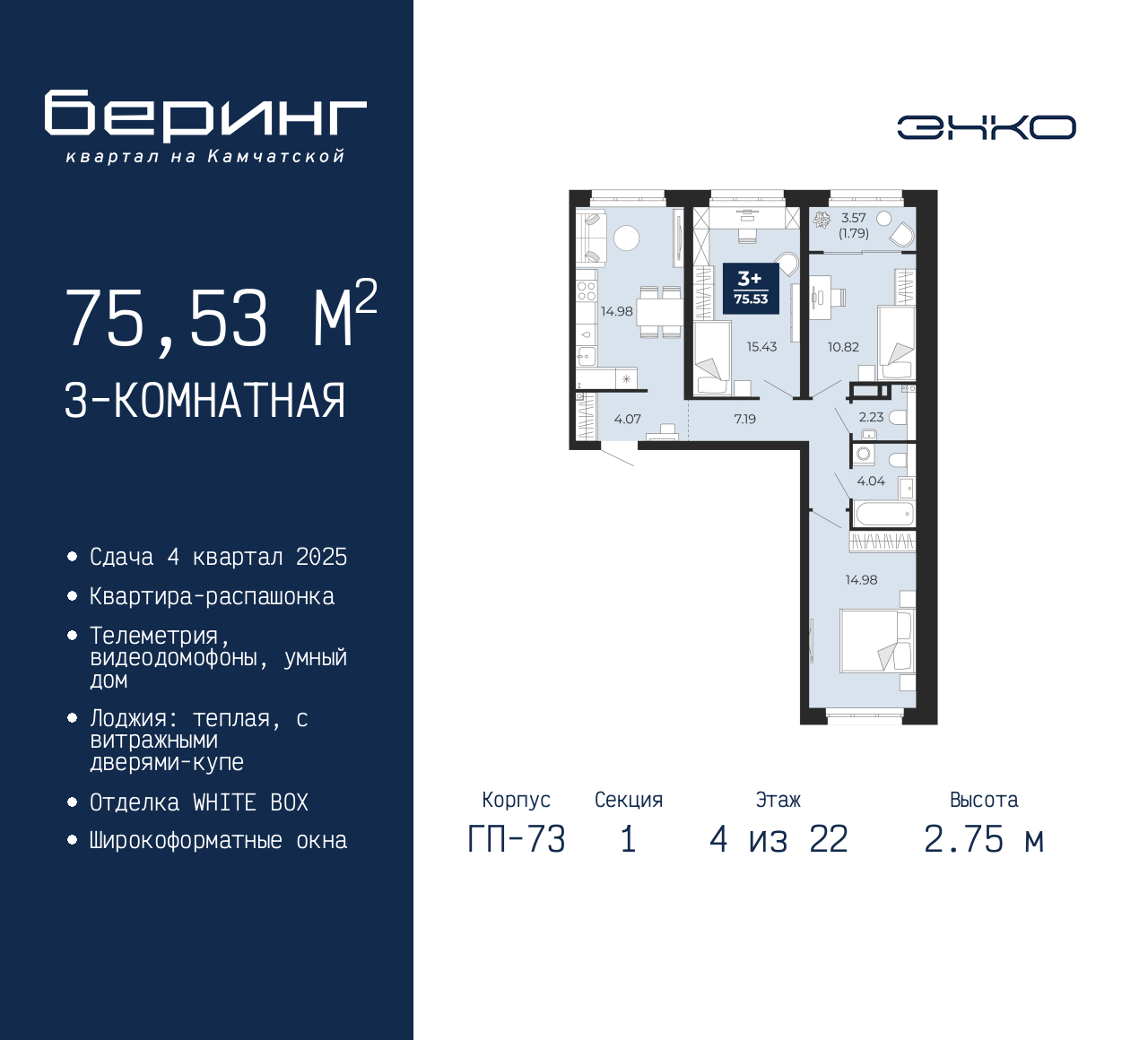 Продается 3-комн. квартира от застройщика в ЖК "Беринг" на 4 этаже. Квартира без отделки, после оформления собственности можно делать ремонт. Общая площадь: 75.53 кв.м., жилая: 41.23 кв.м., площадь просторной кухни-столовой: 14.98 кв.м. Квартира - распашонка, без проходных комнат, окна выходят на paзные стороны дома. В квартире одна лоджия, один совмещенный и один раздельный санузел. Высота потолков 2.75 м. Дом монолитный, многоподъездный, переменной этажности, от 9 до 22 этажей. Квартира находится в 1-й секции высотой 22 этажа в корпусе ГП-73. На этаже 5 квартир. В подъезде 1 пассажирский и 1 грузовой лифт. Окончание строительства - 4 квартал 2025 года. Оформление сделки по договору долевого участия. Подобно знаменитому исследователю, мы чувствуем себя первооткрывателями этой локации. Хотим показать новую суть места, сформировать для вас жизненный опыт, которого ещё не было. Беринг — район зелёного цвета. Беринг — район, который откроется вам с другой стороны. Впечатлит новым уровнем комфорта и качеством жизни. Беринг — открытие на карте города. Первый квартал расположен в районе Тура, в границах улиц: Камчатская – Западносибирская – Энтузиастов. Вокруг уже есть всё для того, чтобы ежедневная рутина была лишь частью жизни и не доставляла дискомфорта. Школы и детские сады, магазины и аптеки, поликлиника, места для семейного отдыха, пеших и велопрогулок, и даже рыбалки. Масштабное озеленение дворов — визитная карточка ЭНКО и ваш оазис спокойствия, чтобы отвлечься от повседневности. Раскидистые деревья, кустарники, травы и цветы — осталось остановиться, вдохнуть и расслабиться, глядя на эту природную красоту. Стилистика подъездов продолжает концепцию Беринга, вдохновлённого Камчаткой: сдержанный, но при этом впечатляющий дизайн соседствует с удобством и функциональностью. (AQID02316276)