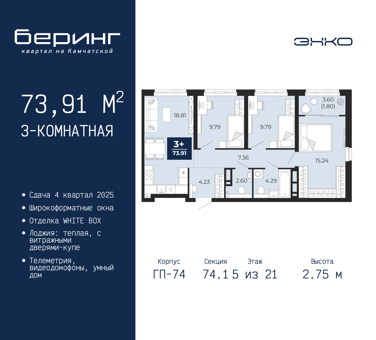 - Общая площадь 73.91 м²