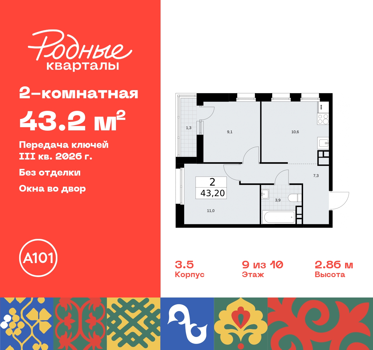 Продается 2-комн. квартира с европланировкой от застройщика в ЖК "Родные кварталы" на 9 этаже. Квартира без отделки, полностью готова к ремонту. Общая площадь: 43.2 кв.м., жилая: 24.8 кв.м., общая площадь гостиной-столовой с кухонной зоной: 21.4 кв.м. Европланировка, в просторной кухне-гостиной удобно как готовить, так и отдыхать. Комнаты изолированные, все окна выходят на одну сторону. В квартире одна лоджия, один совмещенный санузел. Высота потолков 2.95 м. Квартира находится в корпусе 3.5. Дом монолитный, одноподъездный, высотой 10 этажей. На этаже 4 квартиры. В подъезде 1 пассажирский и 1 грузовой лифт. Начало строительства - 2 квартал 2024 года. Окончание строительства - 3 квартал 2026 года. Оформление сделки по договору долевого участия. Артикул квартиры по базе застройщика 96К-3.5-566. ПРЕДЛОЖЕНИЯ ОТ ЗАСТРОЙЩИКА В ОКТЯБРЕ 2025: Ипотека от 13,9 % для всех! На весь срок. "Семейная ипотека" вернулась. Ставка от 3,5 % на весь срок! Без удорожания! Выгодное ипотечное комбо: Ипотека от 2200 р./мес. и от 6 % после рождения ребёнка! Ипотека для всех "Держи пять!" - ставка 5 % на 2 года! *более подробную информацию по скидкам и акциям уточняйте в отделе продаж Новый жилой комплекс "Родные кварталы" строится в уютной, экологически благополучной локации на юго-западе столицы. В ближайшем окружении – ухоженные малоэтажные посёлки и живописный Ульяновский лесопарк. Благодаря этому из окон откроются вдохновляющие виды, которые не исчезнут со временем за фасадами многоэтажек. Через весь район пройдёт главный бульвар, который свяжет набережную, жилые кварталы и площади в единое дружелюбное пространство, органично наполненное узнаваемыми элементами культурных традиций разных народов. В жилом комплексе создаются условия для комфортного отдыха и занятий спортом всех жителей. Здесь можно прогуляться и отдохнуть в лесопарке на берегу ручья, позаниматься на тренажёрах под открытым небом и спортивных площадках. Для малышей построят игровые комплексы, развивающие силу, координацию и ловкость. Всего в жилом комплексе будет оборудовано 6 га территории для спокойного отдыха и около 9 га — для активного. Подъезды в домах освещены в любое время суток, входы и вестибюль хорошо просматриваются с улицы. Витражное остекление обеспечивает приток естественного света днём, а вечером зажигаются светильники. В отделке домов используется сочетание вентилируемого фасада с облицовкой из фибробетонной плитки и штукатуркой. Комфортная высота домов соразмерна человеку и в среднем составляет 10 этажей. Все дома обеспечены собственными подземными паркингами. В них размещаются машино-места и кладовые. В паркинг или кладовую можно спуститься на лифте или по лестнице. В комплексе появятся бытовые сервисы, магазины, аптеки и другие торгово-бытовые объекты. В жилом районе «Родные кварталы» будут построены: - образовательный центр: школа на 1300 учеников и детский сад на 250 малышей, - два детских сада на 200 мест каждый (один из них сдаётся в 1-й очереди). В транспортной доступности уже работают: - школа № 41 и детский сад — по Боровскому шоссе, - школа № 2057 и детский сад — на запад от района, в дер. Марушкино. ЖК «Родные кварталы» строится в Новомосковском округе столицы, в 15 минутах на автомобиле от аэропорта «Внуково». Район обеспечен удобными выездами на три крупные современные автотрассы. Здесь уже работает и актив