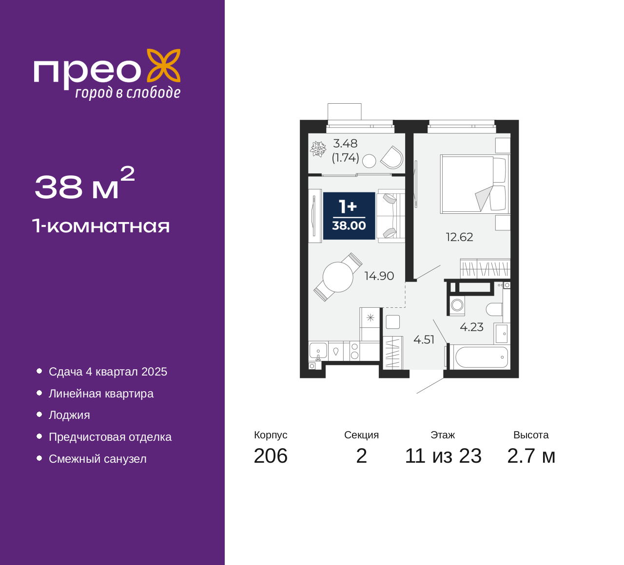 Однокомнатная квартира с предчистовой отделкой в ЖК "Прео" на 11 этаже. Общая площадь: 38 кв.м., жилая: 12.62 кв.м., площадь просторной кухни-столовой: 14.9 кв.м. Все окна выходят на одну сторону. В квартире одна лоджия, один совмещенный санузел. Высота потолков 2.7 м. Дом монолитный, трехподъездный, переменной этажности, от 14 до 23 этажей. Квартира находится во 2-й секции высотой 23 этажа в корпусе 206. На этаже 10 квартир. В подъезде 1 пассажирский и 1 грузовой лифт. Окончание строительства - 4 квартал 2025 года. Оформление сделки по договору долевого участия. Преображенский — один из самых привлекательных районов для жизни! Это полностью самостоятельный жилой район с точки зрения инфраструктуры. Преображенский находится между Московским и Червишевским трактами в квартале улиц Закалужская — Вьюжная — Александра Протозанова. Не нужно ждать, когда появится инфраструктура — переезжайте на всё готовое. Вблизи расположены действующие школа и детский сад. В этом году откроется еще один сад, а в следующем году — школа. По соседству с Преображенским запланировано строительство городского парка «Комарово» площадью 38 гектар. За 10 минут можно доехать на автомобиле до крупных ТРЦ: «Лента», «Кристалл», «Леруа Мерлен», «Метро» и «Ашан». С 2018 года в районе открыт Соседский центр — пространство, созданное для формирования добрососедской среды, совместного досуга, общения и реализации соседских инициатив. Здесь проходят встречи соседей, а также сами жители района организовывают мероприятия. Организатором такого события может стать любой желающий. В квартирах выполнена качественная предчистовая отделка. Гладкие стены с финишным выравниванием по маякам. Ровный потолок для установки натяжного потолка. Установлены пятикамерные окна с двойным стеклопакетом (3 стекла). Дизайнерские холлы с видеонаблюдением, безбарьерным и прозрачным входом – всегда светло и спокойно. На первом этаже есть просторные колясочные, где все жители могут оставлять свои коляски и велосипеды. В Преображенском есть всё, что нужно для активного отдыха и занятий спортом. Мы сделали большое футбольное поле с безопасным покрытием. Также установили хоккейный корт, который оборудован по всем необходимым стандартам. Во дворах можно делать упражнения на специальных площадках с турниками. Весь район мы обустроили велодорожками, которые связаны в единый маршрут. У нас есть сухие фонтаны, бьющие из земли, деревья, веревки, сетки, скалодром, газон, песок и резинка — осталось просто дать своему ребенку право на свободную игру. По-настоящему хорошие дворы — это те, которые дети предпочитают соцсетям и телевизору. Аккредитация в банках: ПАО Банк «ВТБ», ПАО «Банк Уралсиб», ПАО «Газпромбанк», «Сбербанк России», ОАО «Альфа-Банк» и других. (AQID02406135)