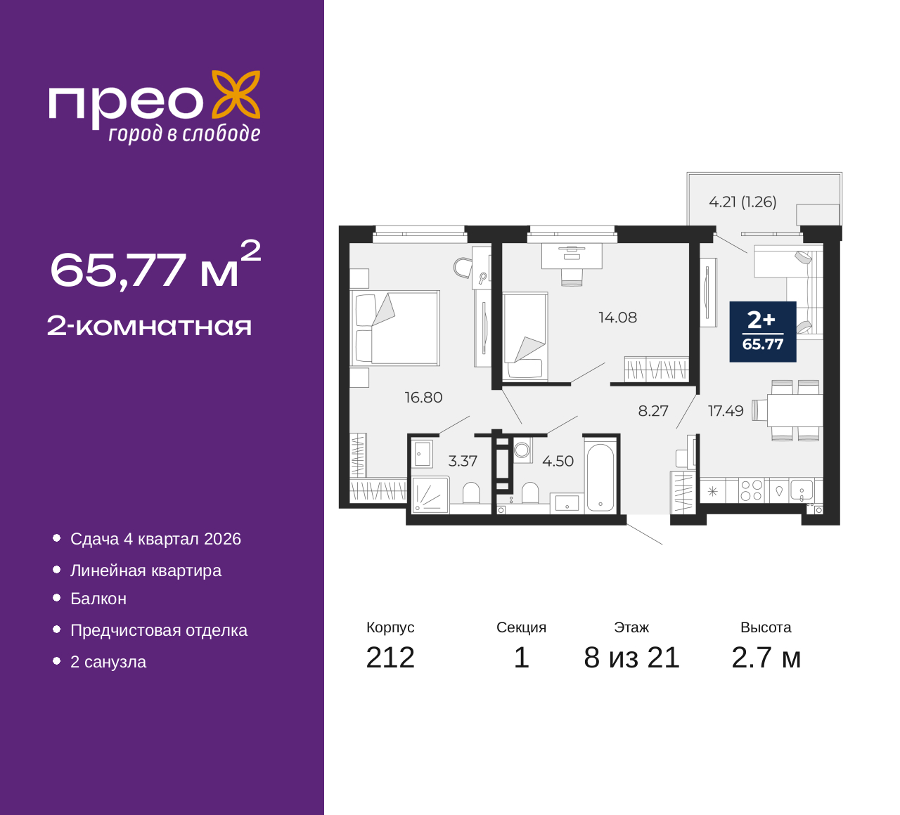 Продается 2-комн. квартира с предчистовой отделкой в ЖК "Прео" на 8 этаже. Общая площадь: 65.77 кв.м., жилая: 30.88 кв.м., площадь просторной кухни-столовой: 17.49 кв.м. Комнаты изолированные, все окна выходят на одну сторону. В квартире один балкон, два совмещенных санузла. Высота потолков 2.7 м. Квартира находится в корпусе 212. Дом монолитный, одноподъездный, высотой 21 этаж. На этаже 8 квартир. В подъезде 2 пассажирских и 1 грузовой лифт. Окончание строительства - 4 квартал 2026 года. Оформление сделки по договору долевого участия. Преображенский — один из самых привлекательных районов для жизни! Это полностью самостоятельный жилой район с точки зрения инфраструктуры. Преображенский находится между Московским и Червишевским трактами в квартале улиц Закалужская — Вьюжная — Александра Протозанова. Не нужно ждать, когда появится инфраструктура — переезжайте на всё готовое. Вблизи расположены действующие школа и детский сад. В этом году откроется еще один сад, а в следующем году — школа. По соседству с Преображенским запланировано строительство городского парка «Комарово» площадью 38 гектар. За 10 минут можно доехать на автомобиле до крупных ТРЦ: «Лента», «Кристалл», «Леруа Мерлен», «Метро» и «Ашан». С 2018 года в районе открыт Соседский центр — пространство, созданное для формирования добрососедской среды, совместного досуга, общения и реализации соседских инициатив. Здесь проходят встречи соседей, а также сами жители района организовывают мероприятия. Организатором такого события может стать любой желающий. В квартирах выполнена качественная предчистовая отделка. Гладкие стены с финишным выравниванием по маякам. Ровный потолок для установки натяжного потолка. Установлены пятикамерные окна с двойным стеклопакетом (3 стекла). Дизайнерские холлы с видеонаблюдением, безбарьерным и прозрачным входом – всегда светло и спокойно. На первом этаже есть просторные колясочные, где все жители могут оставлять свои коляски и велосипеды. В Преображенском есть всё, что нужно для активного отдыха и занятий спортом. Мы сделали большое футбольное поле с безопасным покрытием. Также установили хоккейный корт, который оборудован по всем необходимым стандартам. Во дворах можно делать упражнения на специальных площадках с турниками. Весь район мы обустроили велодорожками, которые связаны в единый маршрут. У нас есть сухие фонтаны, бьющие из земли, деревья, веревки, сетки, скалодром, газон, песок и резинка — осталось просто дать своему ребенку право на свободную игру. По-настоящему хорошие дворы — это те, которые дети предпочитают соцсетям и телевизору. Аккредитация в банках: ПАО «Банк Уралсиб», ПАО «Газпромбанк», ОАО «Альфа-Банк», «Сбербанк России», ПАО Банк «ВТБ» и других. (AQID02427702)
