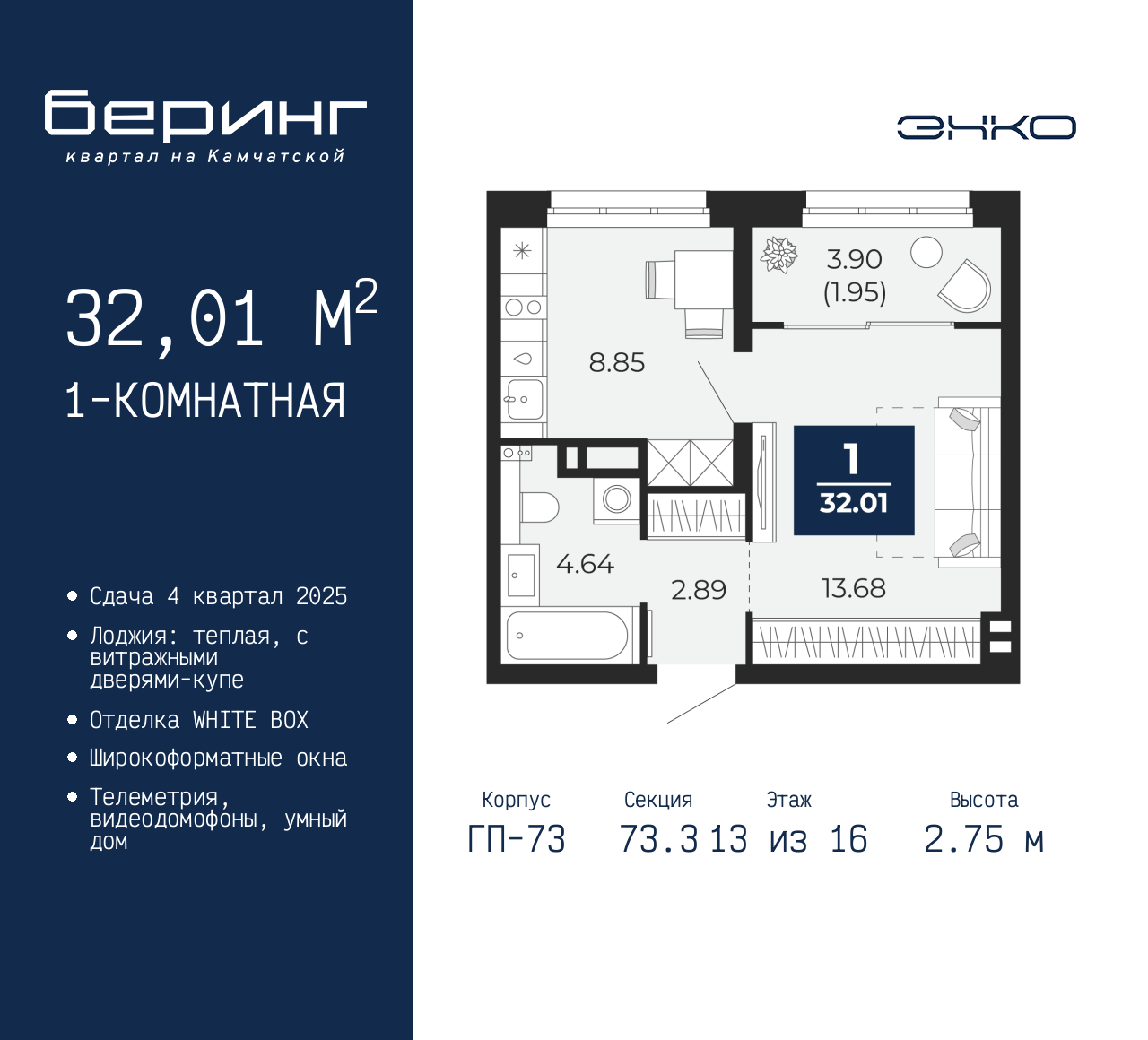 Однокомнатная квартира в ЖК "Беринг" на 13 этаже. Квартира без отделки, после выдачи ключей можно делать ремонт. Общая площадь: 32.01 кв.м., жилая: 13.68 кв.м., площадь кухни: 8.85 кв.м. Все окна выходят на одну сторону. В квартире одна лоджия, один совмещенный санузел. Высота потолков 2.75 м. Дом монолитный, многоподъездный, переменной этажности, от 9 до 22 этажей. Квартира находится в 73.3-й секции высотой 16 этажей в корпусе ГП-73. На этаже 8 квартир. В подъезде 1 пассажирский и 1 грузовой лифт. Окончание строительства - 4 квартал 2025 года. Оформление сделки по договору долевого участия. Подобно знаменитому исследователю, мы чувствуем себя первооткрывателями этой локации. Хотим показать новую суть места, сформировать для вас жизненный опыт, которого ещё не было. Беринг — район зелёного цвета. Беринг — район, который откроется вам с другой стороны. Впечатлит новым уровнем комфорта и качеством жизни. Беринг — открытие на карте города. Первый квартал расположен в районе Тура, в границах улиц: Камчатская – Западносибирская – Энтузиастов. Вокруг уже есть всё для того, чтобы ежедневная рутина была лишь частью жизни и не доставляла дискомфорта. Школы и детские сады, магазины и аптеки, поликлиника, места для семейного отдыха, пеших и велопрогулок, и даже рыбалки. Масштабное озеленение дворов — визитная карточка ЭНКО и ваш оазис спокойствия, чтобы отвлечься от повседневности. Раскидистые деревья, кустарники, травы и цветы — осталось остановиться, вдохнуть и расслабиться, глядя на эту природную красоту. Стилистика подъездов продолжает концепцию Беринга, вдохновлённого Камчаткой: сдержанный, но при этом впечатляющий дизайн соседствует с удобством и функциональностью. (AQID02315472)