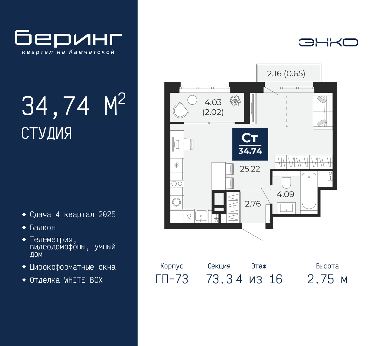 1-комн. квартира-студия от застройщика в ЖК "Беринг" на 4 этаже. Квартира без отделки, полностью готова к чистовой отделке и дальнейшему ремонту. Общая площадь: 34.74 кв.м., площадь гостиной 25.22 кв.м., из которых 5 кв.м. выделено под кухонную зону. Все окна выходят на одну сторону. В квартире один балкон, один совмещенный санузел. Высота потолков 2.75 м. Дом монолитный, многоподъездный, переменной этажности, от 9 до 22 этажей. Квартира находится в 73.3-й секции высотой 16 этажей в корпусе ГП-73. На этаже 8 квартир. В подъезде 1 пассажирский и 1 грузовой лифт. Окончание строительства - 4 квартал 2025 года. Оформление сделки по договору долевого участия. Подобно знаменитому исследователю, мы чувствуем себя первооткрывателями этой локации. Хотим показать новую суть места, сформировать для вас жизненный опыт, которого ещё не было. Беринг — район зелёного цвета. Беринг — район, который откроется вам с другой стороны. Впечатлит новым уровнем комфорта и качеством жизни. Беринг — открытие на карте города. Первый квартал расположен в районе Тура, в границах улиц: Камчатская – Западносибирская – Энтузиастов. Вокруг уже есть всё для того, чтобы ежедневная рутина была лишь частью жизни и не доставляла дискомфорта. Школы и детские сады, магазины и аптеки, поликлиника, места для семейного отдыха, пеших и велопрогулок, и даже рыбалки. Масштабное озеленение дворов — визитная карточка ЭНКО и ваш оазис спокойствия, чтобы отвлечься от повседневности. Раскидистые деревья, кустарники, травы и цветы — осталось остановиться, вдохнуть и расслабиться, глядя на эту природную красоту. Стилистика подъездов продолжает концепцию Беринга, вдохновлённого Камчаткой: сдержанный, но при этом впечатляющий дизайн соседствует с удобством и функциональностью. (AQID02315570)