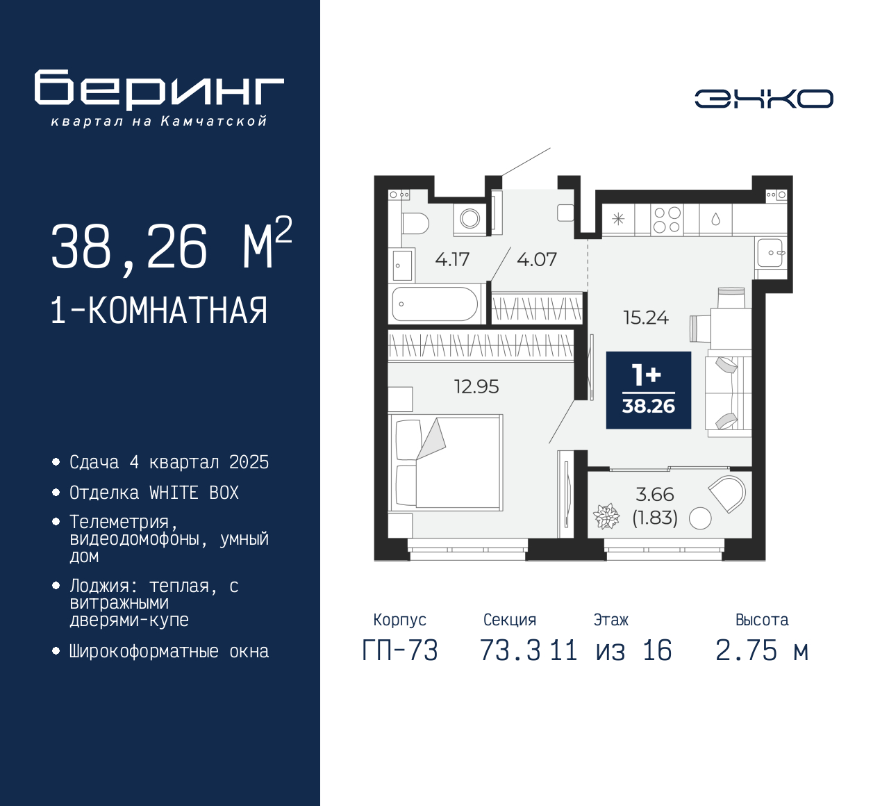 Продается однокомнатная квартира от застройщика в ЖК "Беринг" на 11 этаже. Квартира без отделки, полностью готова к ремонту. Общая площадь: 38.26 кв.м., жилая: 12.95 кв.м., площадь просторной кухни-столовой: 15.48 кв.м. Все окна выходят на одну сторону. В квартире одна лоджия, один совмещенный санузел. Высота потолков 2.75 м. Дом монолитный, многоподъездный, переменной этажности, от 9 до 22 этажей. Квартира находится в 73.3-й секции высотой 16 этажей в корпусе ГП-73. На этаже 8 квартир. В подъезде 1 пассажирский и 1 грузовой лифт. Окончание строительства - 4 квартал 2025 года. Оформление сделки по договору долевого участия. Подобно знаменитому исследователю, мы чувствуем себя первооткрывателями этой локации. Хотим показать новую суть места, сформировать для вас жизненный опыт, которого ещё не было. Беринг — район зелёного цвета. Беринг — район, который откроется вам с другой стороны. Впечатлит новым уровнем комфорта и качеством жизни. Беринг — открытие на карте города. Первый квартал расположен в районе Тура, в границах улиц: Камчатская – Западносибирская – Энтузиастов. Вокруг уже есть всё для того, чтобы ежедневная рутина была лишь частью жизни и не доставляла дискомфорта. Школы и детские сады, магазины и аптеки, поликлиника, места для семейного отдыха, пеших и велопрогулок, и даже рыбалки. Масштабное озеленение дворов — визитная карточка ЭНКО и ваш оазис спокойствия, чтобы отвлечься от повседневности. Раскидистые деревья, кустарники, травы и цветы — осталось остановиться, вдохнуть и расслабиться, глядя на эту природную красоту. Стилистика подъездов продолжает концепцию Беринга, вдохновлённого Камчаткой: сдержанный, но при этом впечатляющий дизайн соседствует с удобством и функциональностью. (AQID02315661)