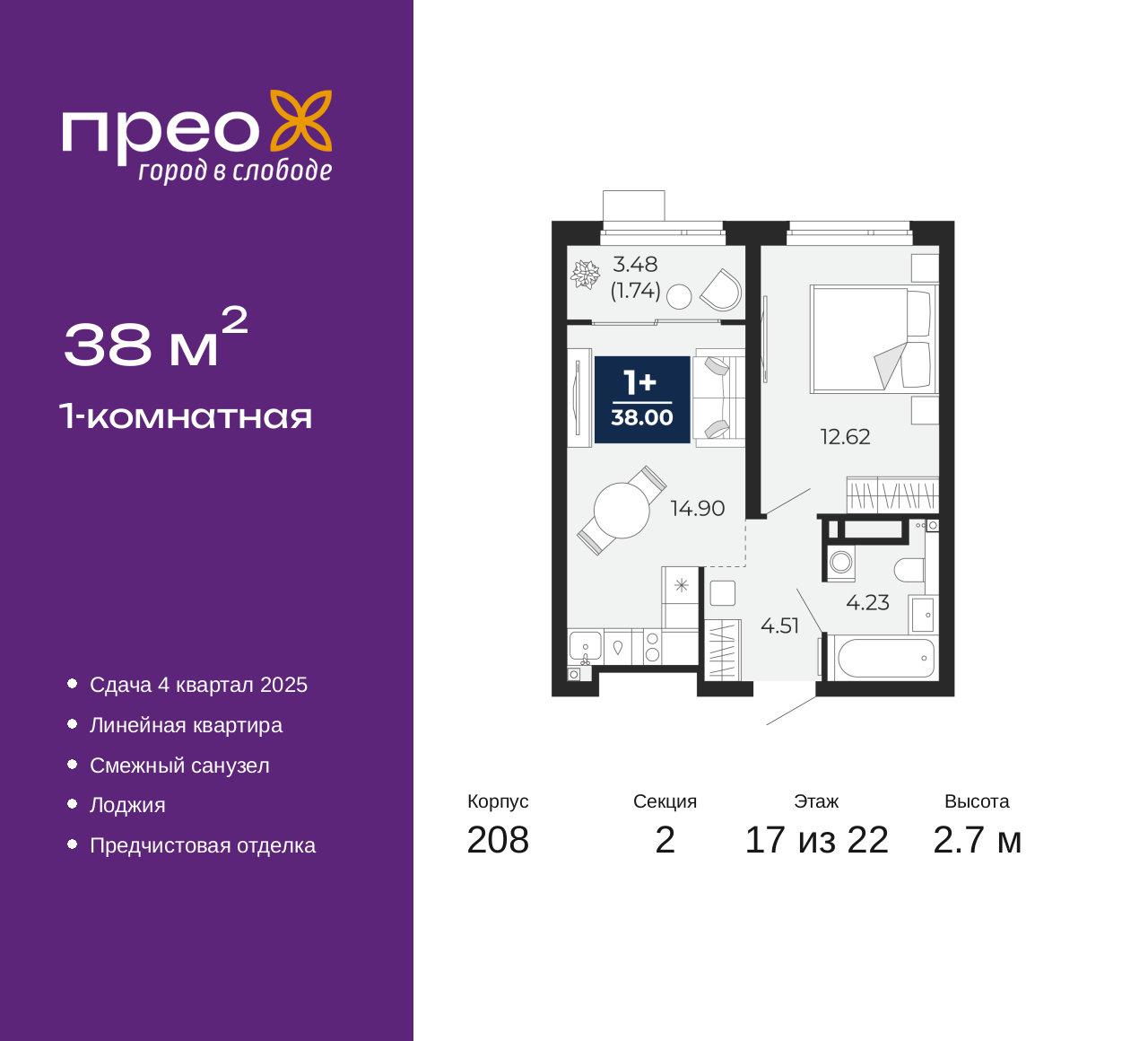 Продается 1-комн. квартира с предчистовой отделкой в ЖК "Прео" на 17 этаже. Общая площадь: 38 кв.м., жилая: 12.62 кв.м., площадь просторной кухни-столовой: 14.9 кв.м. Все окна выходят на одну сторону. В квартире одна лоджия, один совмещенный санузел. Высота потолков 2.7 м. Дом монолитный, трехподъездный, переменной этажности, от 14 до 22 этажей. Квартира находится во 2-й секции высотой 22 этажа в корпусе 208. На этаже 10 квартир. В подъезде 1 пассажирский и 1 грузовой лифт. Окончание строительства - 4 квартал 2025 года. Оформление сделки по договору долевого участия. Преображенский — один из самых привлекательных районов для жизни! Это полностью самостоятельный жилой район с точки зрения инфраструктуры. Преображенский находится между Московским и Червишевским трактами в квартале улиц Закалужская — Вьюжная — Александра Протозанова. Не нужно ждать, когда появится инфраструктура — переезжайте на всё готовое. Вблизи расположены действующие школа и детский сад. В этом году откроется еще один сад, а в следующем году — школа. По соседству с Преображенским запланировано строительство городского парка «Комарово» площадью 38 гектар. За 10 минут можно доехать на автомобиле до крупных ТРЦ: «Лента», «Кристалл», «Леруа Мерлен», «Метро» и «Ашан». С 2018 года в районе открыт Соседский центр — пространство, созданное для формирования добрососедской среды, совместного досуга, общения и реализации соседских инициатив. Здесь проходят встречи соседей, а также сами жители района организовывают мероприятия. Организатором такого события может стать любой желающий. В квартирах выполнена качественная предчистовая отделка. Гладкие стены с финишным выравниванием по маякам. Ровный потолок для установки натяжного потолка. Установлены пятикамерные окна с двойным стеклопакетом (3 стекла). Дизайнерские холлы с видеонаблюдением, безбарьерным и прозрачным входом – всегда светло и спокойно. На первом этаже есть просторные колясочные, где все жители могут оставлять свои коляски и велосипеды. В Преображенском есть всё, что нужно для активного отдыха и занятий спортом. Мы сделали большое футбольное поле с безопасным покрытием. Также установили хоккейный корт, который оборудован по всем необходимым стандартам. Во дворах можно делать упражнения на специальных площадках с турниками. Весь район мы обустроили велодорожками, которые связаны в единый маршрут. У нас есть сухие фонтаны, бьющие из земли, деревья, веревки, сетки, скалодром, газон, песок и резинка — осталось просто дать своему ребенку право на свободную игру. По-настоящему хорошие дворы — это те, которые дети предпочитают соцсетям и телевизору. Аккредитация в банках: ОАО «Альфа-Банк», «Сбербанк России», ПАО «Газпромбанк», ПАО «Банк Уралсиб», ПАО Банк «ВТБ» и других. (AQID02355239)
