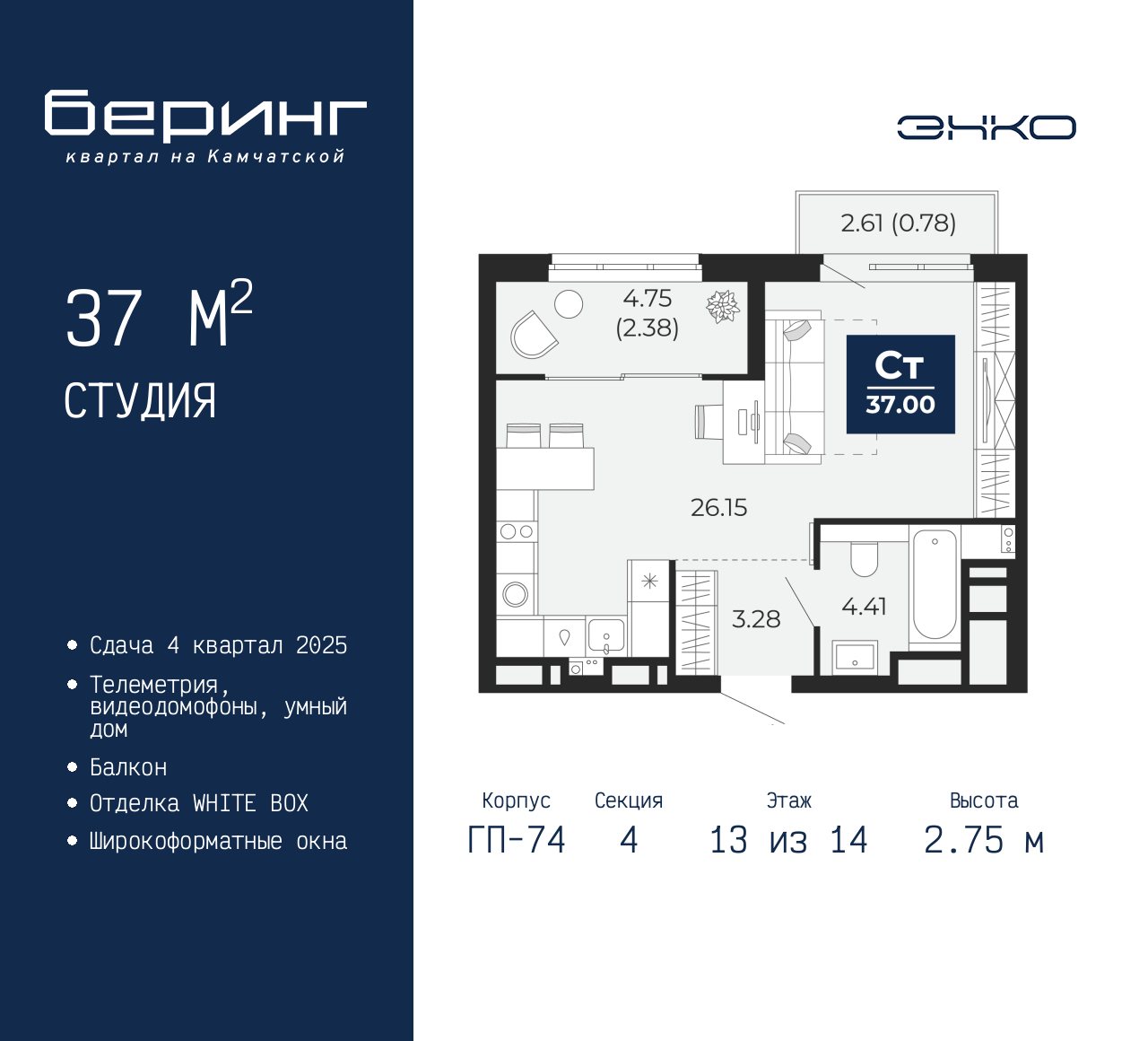 Продается однокомнатная квартира-студия от застройщика в ЖК "Беринг" на 13 этаже. Квартира без отделки, полностью готова к ремонту. Общая площадь: 37 кв.м., площадь гостиной 26.15 кв.м., из которых 5 кв.м. выделено под кухонную зону. Все окна выходят на одну сторону. В квартире один балкон, один совмещенный санузел. Высота потолков 2.75 м. Дом монолитный, многоподъездный, переменной этажности, от 9 до 21 этажей. Квартира находится в 4-й секции высотой 14 этажей в корпусе ГП-74. На этаже 7 квартир. В подъезде 1 пассажирский и 1 грузовой лифт. Окончание строительства - 4 квартал 2025 года. Оформление сделки по договору долевого участия. Подобно знаменитому исследователю, мы чувствуем себя первооткрывателями этой локации. Хотим показать новую суть места, сформировать для вас жизненный опыт, которого ещё не было. Беринг — район зелёного цвета. Беринг — район, который откроется вам с другой стороны. Впечатлит новым уровнем комфорта и качеством жизни. Беринг — открытие на карте города. Первый квартал расположен в районе Тура, в границах улиц: Камчатская – Западносибирская – Энтузиастов. Вокруг уже есть всё для того, чтобы ежедневная рутина была лишь частью жизни и не доставляла дискомфорта. Школы и детские сады, магазины и аптеки, поликлиника, места для семейного отдыха, пеших и велопрогулок, и даже рыбалки. Масштабное озеленение дворов — визитная карточка ЭНКО и ваш оазис спокойствия, чтобы отвлечься от повседневности. Раскидистые деревья, кустарники, травы и цветы — осталось остановиться, вдохнуть и расслабиться, глядя на эту природную красоту. Стилистика подъездов продолжает концепцию Беринга, вдохновлённого Камчаткой: сдержанный, но при этом впечатляющий дизайн соседствует с удобством и функциональностью. (AQID02315725)