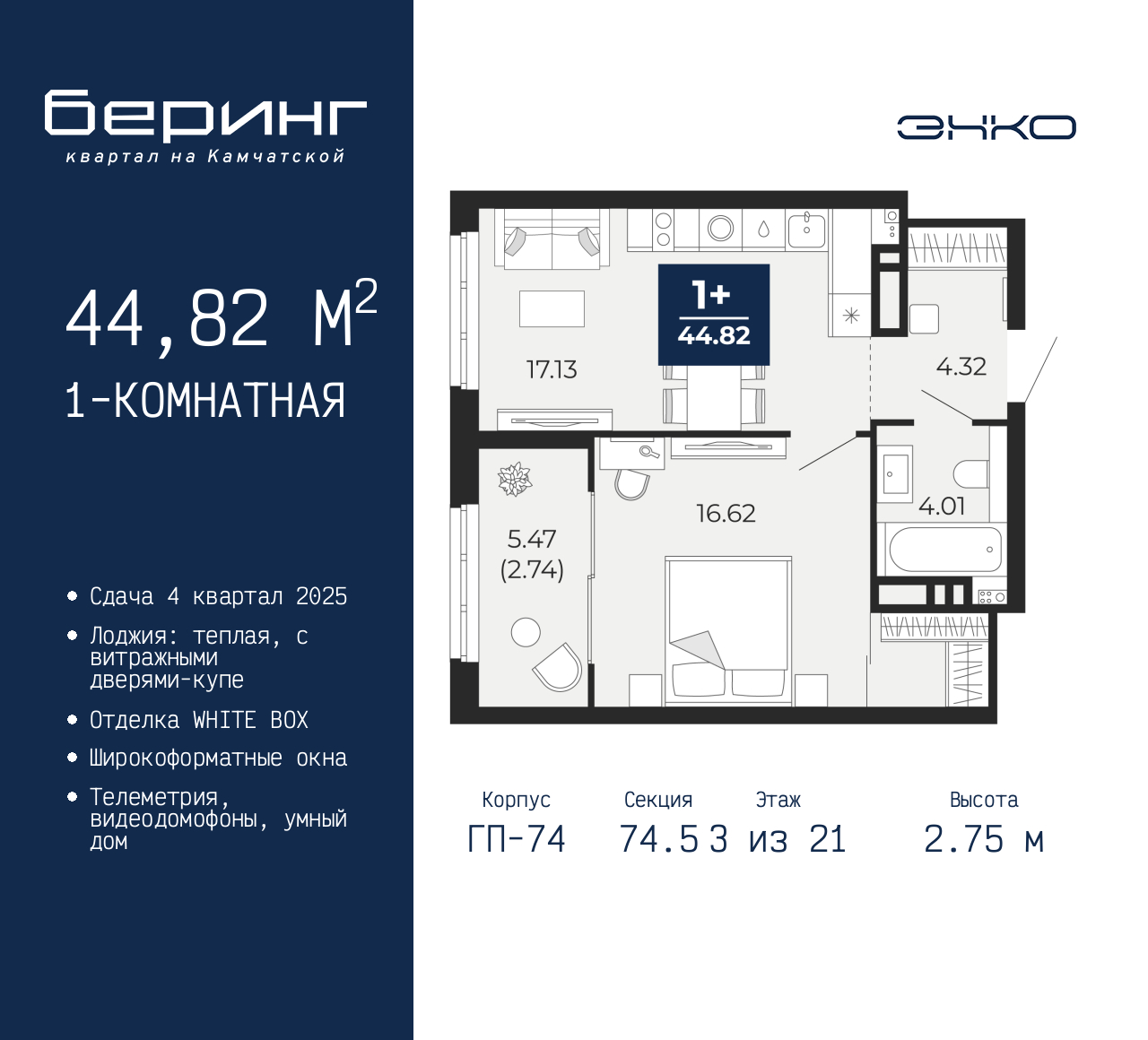 Просторная 1-комн. квартира в ЖК "Беринг" на 3 этаже. Квартира без отделки, полностью готова к чистовой отделке и дальнейшему ремонту. Общая площадь: 44.82 кв.м., жилая: 16.62 кв.м., площадь просторной кухни-столовой: 17.13 кв.м. Все окна выходят на одну сторону. В квартире одна лоджия, один совмещенный санузел. Высота потолков 2.75 м. Дом монолитный, многоподъездный, переменной этажности, от 9 до 21 этажей. Квартира находится в 74.5-й секции высотой 21 этаж в корпусе ГП-74. На этаже 7 квартир. В подъезде 1 пассажирский и 1 грузовой лифт. Окончание строительства - 4 квартал 2025 года. Оформление сделки по договору долевого участия. Подобно знаменитому исследователю, мы чувствуем себя первооткрывателями этой локации. Хотим показать новую суть места, сформировать для вас жизненный опыт, которого ещё не было. Беринг — район зелёного цвета. Беринг — район, который откроется вам с другой стороны. Впечатлит новым уровнем комфорта и качеством жизни. Беринг — открытие на карте города. Первый квартал расположен в районе Тура, в границах улиц: Камчатская – Западносибирская – Энтузиастов. Вокруг уже есть всё для того, чтобы ежедневная рутина была лишь частью жизни и не доставляла дискомфорта. Школы и детские сады, магазины и аптеки, поликлиника, места для семейного отдыха, пеших и велопрогулок, и даже рыбалки. Масштабное озеленение дворов — визитная карточка ЭНКО и ваш оазис спокойствия, чтобы отвлечься от повседневности. Раскидистые деревья, кустарники, травы и цветы — осталось остановиться, вдохнуть и расслабиться, глядя на эту природную красоту. Стилистика подъездов продолжает концепцию Беринга, вдохновлённого Камчаткой: сдержанный, но при этом впечатляющий дизайн соседствует с удобством и функциональностью. (AQID02315816)