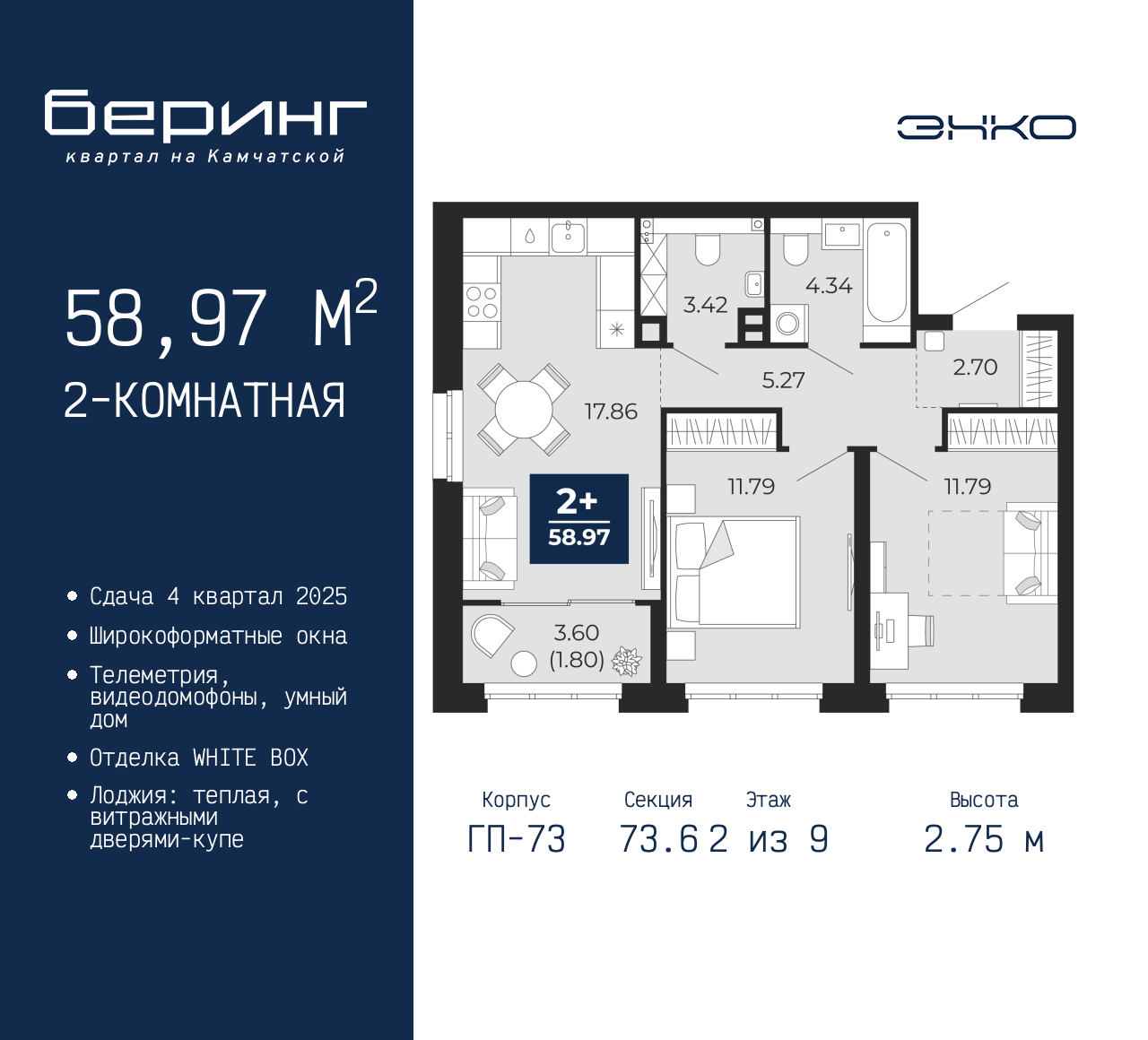 Просторная двухкомнатная квартира в ЖК "Беринг" на 2 этаже. Квартира без отделки, новый владелец может сделать ремонт по индивидуальному проекту. Общая площадь: 58.97 кв.м., жилая: 23.58 кв.м., площадь просторной кухни-столовой: 17.86 кв.м. Квартира угловая, очень светлая, естественная вентиляция при открытии окон. В квартире одна лоджия, один совмещенный и один раздельный санузел. Высота потолков 2.75 м. Дом монолитный, многоподъездный, переменной этажности, от 9 до 22 этажей. Квартира находится в 73.6-й секции высотой 9 этажей в корпусе ГП-73. На этаже 5 квартир. В подъезде 1 пассажирский и 1 грузовой лифт. Окончание строительства - 4 квартал 2025 года. Оформление сделки по договору долевого участия. Подобно знаменитому исследователю, мы чувствуем себя первооткрывателями этой локации. Хотим показать новую суть места, сформировать для вас жизненный опыт, которого ещё не было. Беринг — район зелёного цвета. Беринг — район, который откроется вам с другой стороны. Впечатлит новым уровнем комфорта и качеством жизни. Беринг — открытие на карте города. Первый квартал расположен в районе Тура, в границах улиц: Камчатская – Западносибирская – Энтузиастов. Вокруг уже есть всё для того, чтобы ежедневная рутина была лишь частью жизни и не доставляла дискомфорта. Школы и детские сады, магазины и аптеки, поликлиника, места для семейного отдыха, пеших и велопрогулок, и даже рыбалки. Масштабное озеленение дворов — визитная карточка ЭНКО и ваш оазис спокойствия, чтобы отвлечься от повседневности. Раскидистые деревья, кустарники, травы и цветы — осталось остановиться, вдохнуть и расслабиться, глядя на эту природную красоту. Стилистика подъездов продолжает концепцию Беринга, вдохновлённого Камчаткой: сдержанный, но при этом впечатляющий дизайн соседствует с удобством и функциональностью. (AQID02316040)